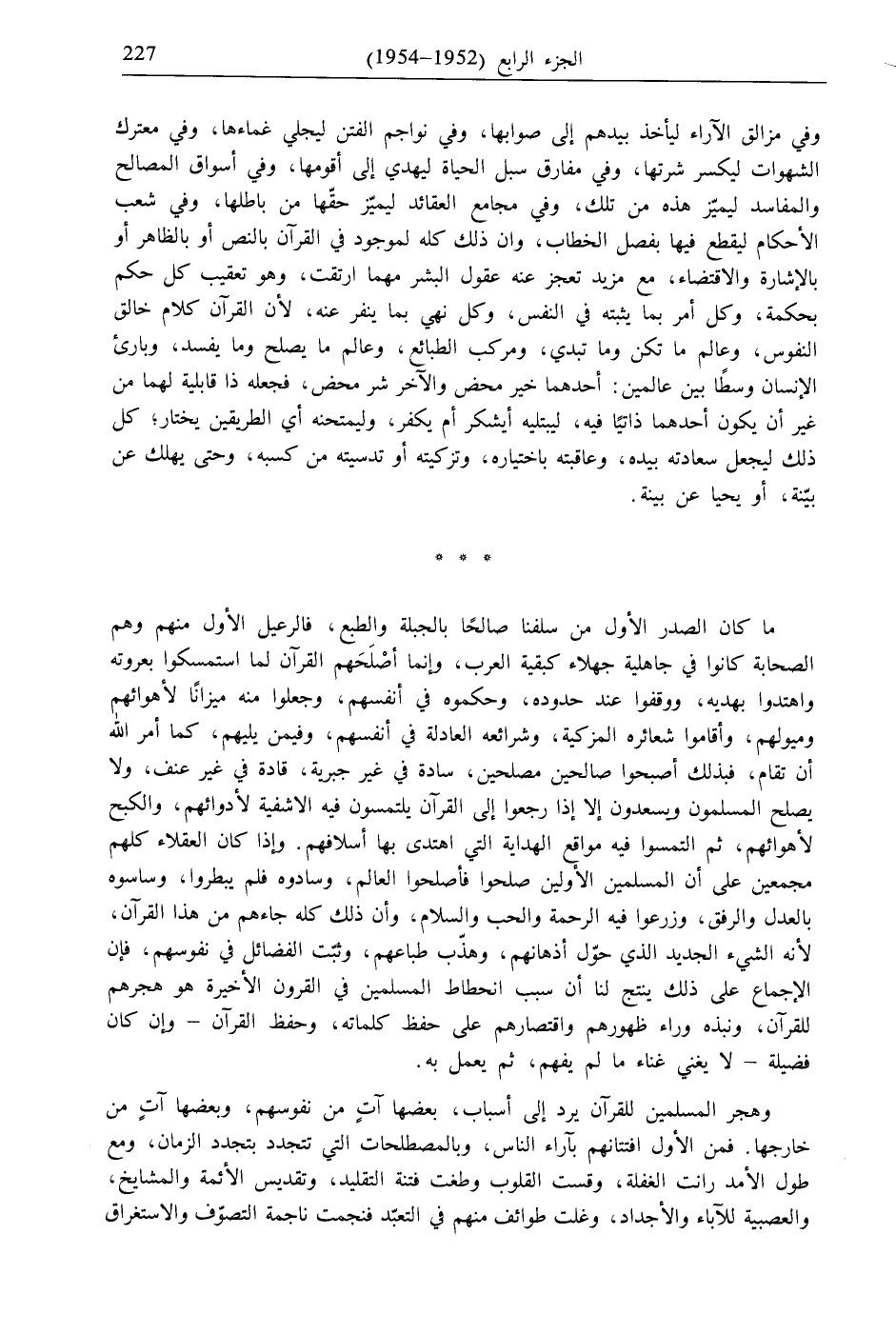 ما كان الصدر الأول من سلفنا صالحًا بالجبلة والطبع، فالرعيل الأول منهم وهم الصحابة كانوا في جاهلية جهلاء كبقية العرب، وإنما أصْلَحَهم القرآن لما استمسكوا بعروته واهتدوا بهديه، ووقفوا عند حدوده، وحكموه في أنفسهم، وجعلوا منه ميزانًا لأهوائهم وميولهم، وأقاموا شعائره المزكية، وشرائعه العادلة في أنفسهم، وفيمن يليهم، كما أمر الله أن تقام، فبذلك أصبحوا صالحين مصلحين، سادة في غير جبرية، قادة في غير عنف، ولا يصلح المسلمون ويسعدون إلا إذا رجعوا إلى القرآن يلتمسون فيه الاشفية لأدوائهم، والكبح لأهوائهم، ثم التمسوا فيه مواقع الهداية التي اهتدى بها أسلافهم. وإذا كان العقلاء كلهم مجمعين على أن المسلمين الأولين صلحوا فأصلحوا العالم، وسادوه فلم يبطروا، وساسوه بالعدل والرفق، وزرعوا فيه الرحمة والحب والسلام، وأن ذلك كله جاءهم من هذا القرآن، لأنه الشيء الجديد الذي حوّل أذهانهم، وهذّب طباعهم، وثبّت الفضائل في نفوسهم، فإن الإجماع على ذلك ينتج لنا أن سبب انحطاط المسلمين في القرون الأخيرة هو هجرهم للقرآن، ونبذه وراء ظهورهم واقتصارهم على حفظ كلماته، وحفظ القرآن- وإن كان فضيلة- لا يغني غناء ما لم يفهم، ثم يعمل به.