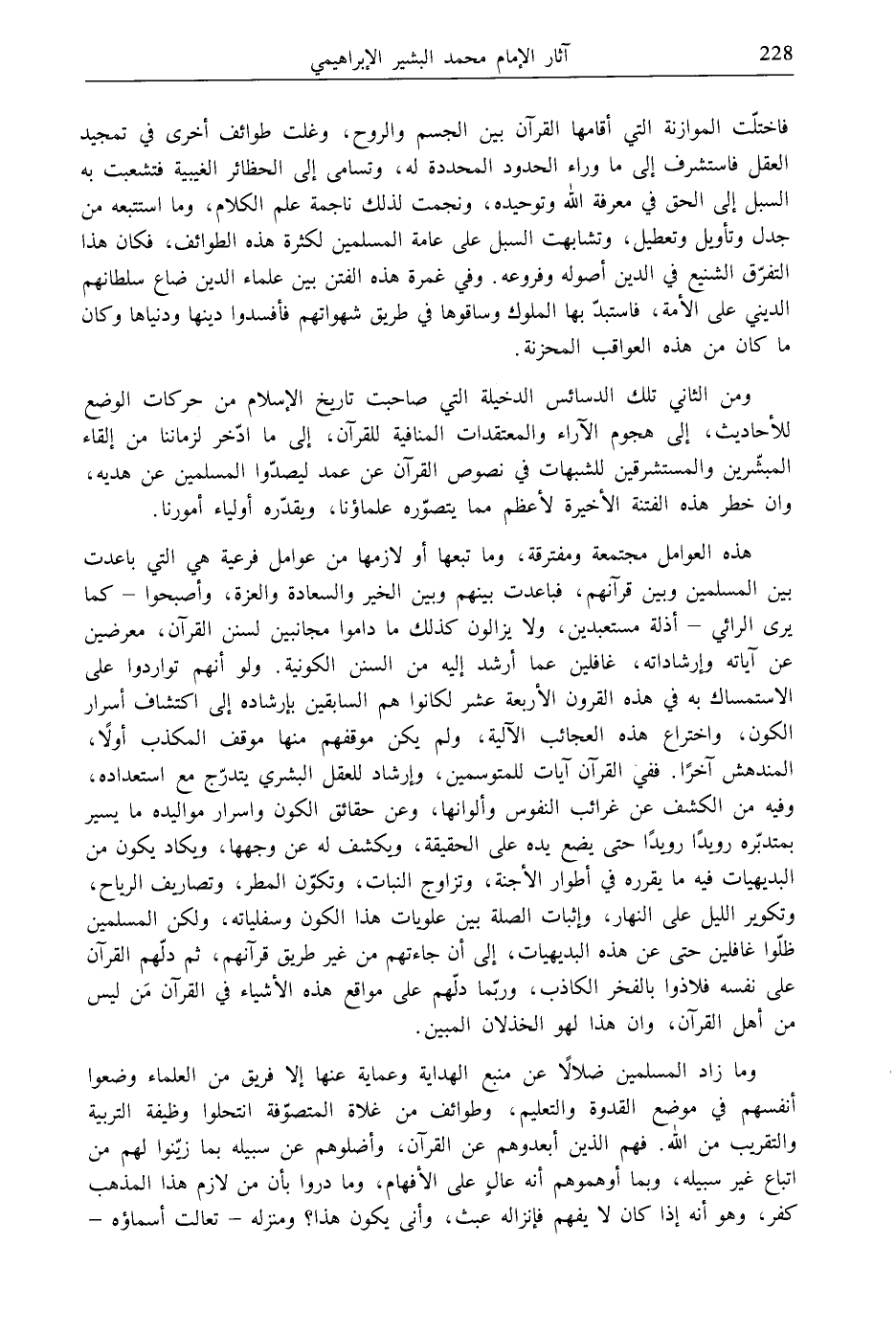 وما زاد المسلمين ضلالًا عن منبع الهداية وعماية عنها إلا فريق من العلماء وضعوا أنفسهم في موضع القدوة والتعليم، وطوائف من غلاة المتصوّفة انتحلوا وظيفة التربية والتقريب من الله. فهم الذين أبعدوهم عن القرآن، وأضلوهم عن سبيله بما زّينوا لهم من اتباع غير سبيله، وبما أوهموهم أنه عالٍ على الأفهام، وما دروا بأن من لازم هذا المذهب كفر، وهو أنه إذا كان لا يفهم فإنزاله عبث، وأنى يكون هذا؟ ومنزله- تعالت أسماؤه-