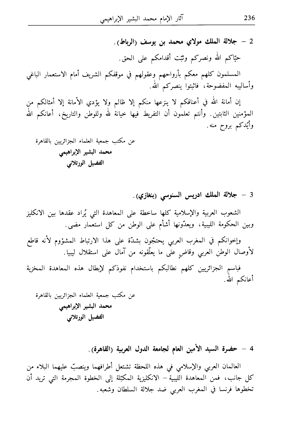 وإخوانكم في المغرب العربي يحتجّون بشدّة على هذا الارتباط المشؤوم لأنه قاطع لأوصال الوطن العربي وقاضٍ على ما يعلّقونه من آمال على استقلال ليبيا.