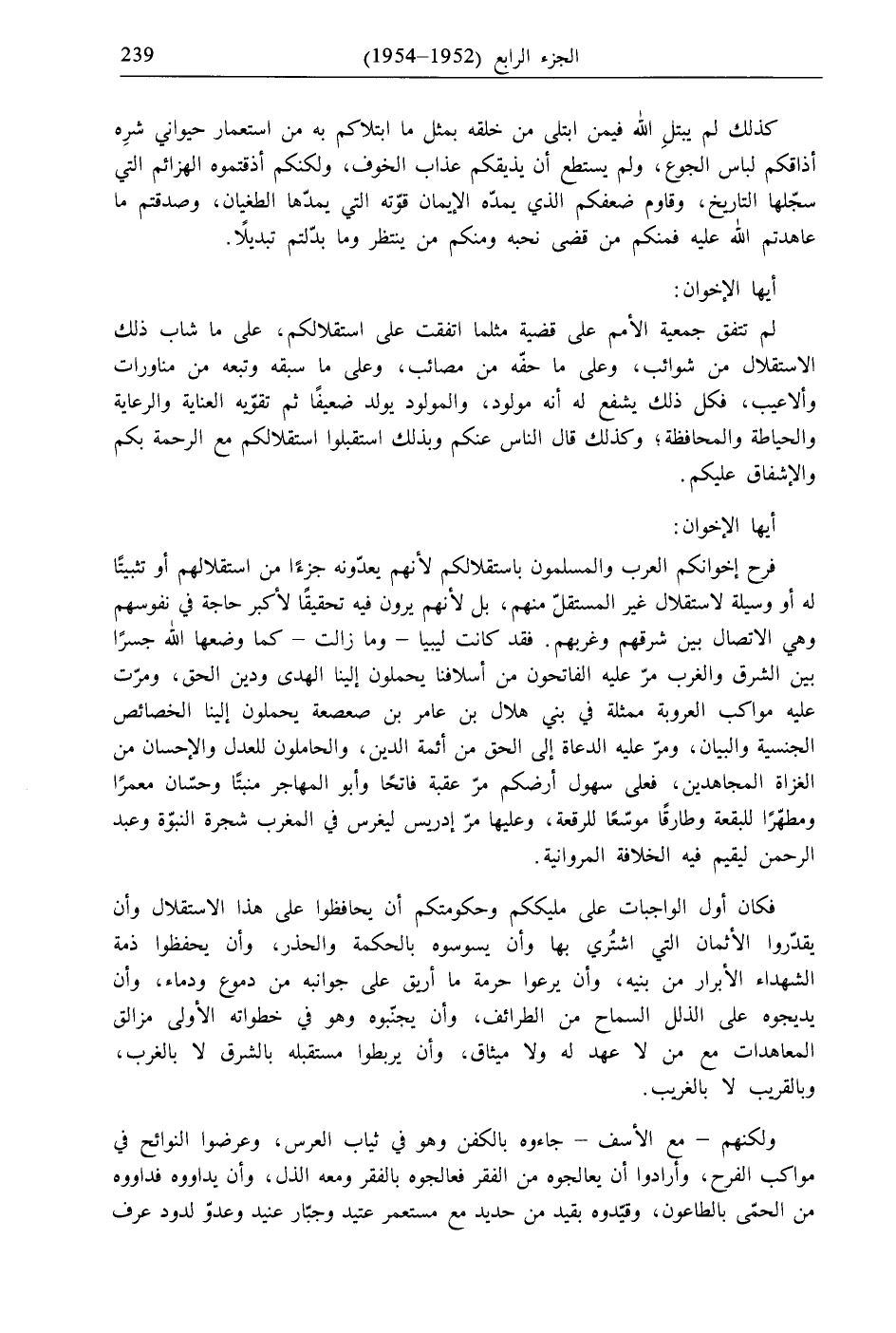 فرح إخوانكم العرب والمسلمون باستقلالكم لأنهم يعدّونه جزءًا من استقلالهم أو تثبيتًا له أو وسيلة لاستقلال غير المستقلّ منهم، بل لأنهم يرون فيه تحقيقًا لأكبر حاجة في نفوسهم وهي الاتصال بين شرقهم وغربهم. فقد كانت ليبيا- وما زالت- كما وضعها الله جسرًا بين الشرق والغرب مرّ عليه الفاتحون من أسلافنا يحملون إلينا الهدى ودين الحق، ومرّت عليه مواكب العروبة ممثلة في بني هلال بن عامر بن صعصعة يحملون إلينا الخصائص الجنسية والبيان، ومرّ عليه الدعاة إلى الحق من أئمة الدين، والحاملون للعدل والإحسان من الغزاة المجاهدين، فعلى سهول أرضكم مرّ عقبة فاتحًا وأبو المهاجر منبتًا وحسّان معمرًا ومطهّرًا للبقعة وطارقًا موسّعًا للرقعة، وعليها مرّ إدريس ليغرس في المغرب شجرة النبوّة وعبد الرحمن ليقيم فيه الخلافة المروانية.