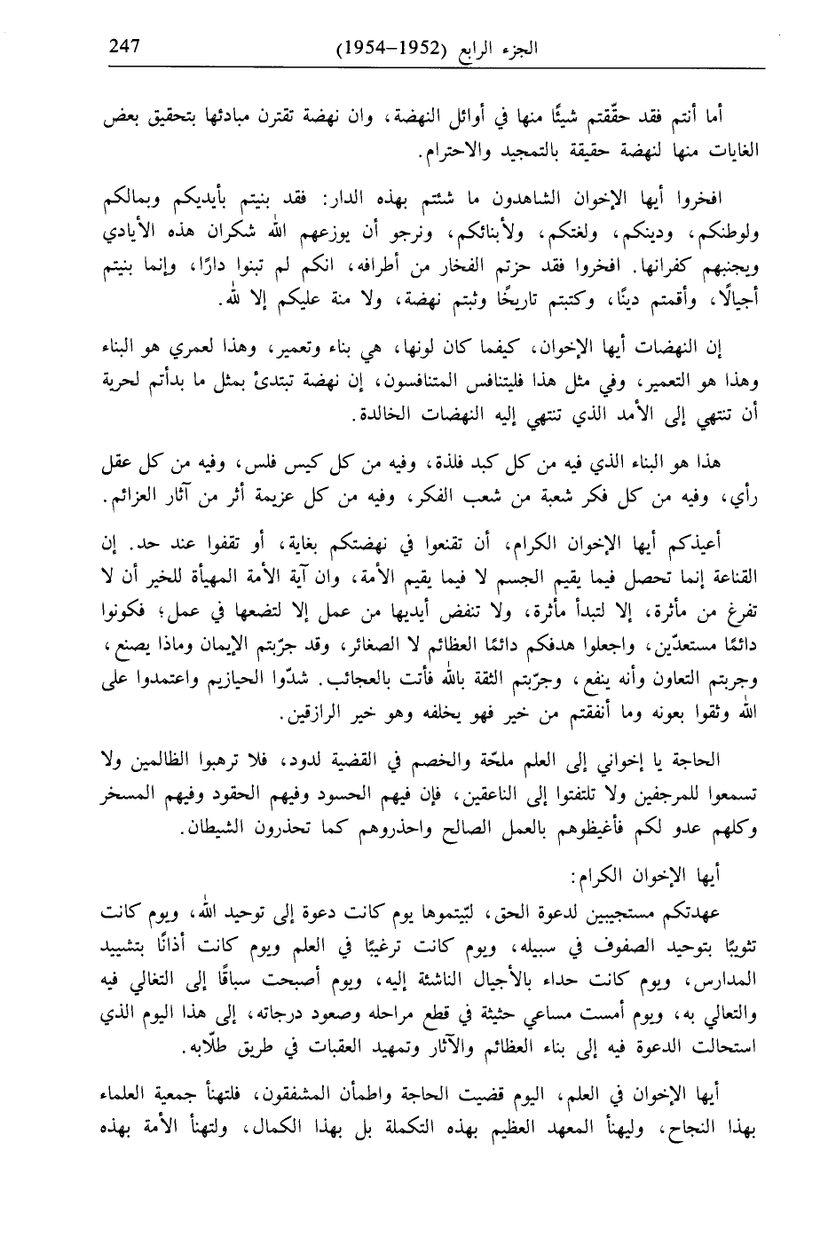 عهدتكم مستجيبين لدعوة الحق، لبّيتموها يوم كانت دعوة إلى توحيد الله، ويوم كانت تثويبًا بتوحيد الصفوف في سبيله، ويوم كانت ترغيبًا في العلم ويوم كانت أذانًا بتشييد المدارس، ويوم كانت حداء بالأجيال الناشئة إليه، ويوم أصبحت سباقًا إلى التغالي فيه والتعالي به، ويوم أمست مساعي حثيثة في قطع مراحله وصعود درجاته، إلى هذا اليوم الذي استحالت الدعوة فيه إلى بناء العظائم والآثار وتمهيد العقبات في طريق طلّابه.
