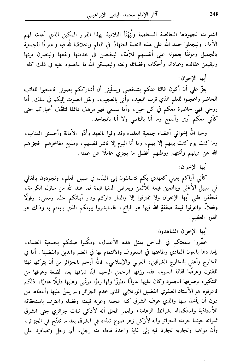 وحيا الله إخواني أعضاء جمعية العلماء وقد وفوا بالعهد وأدّوا الأمانة وأحسنوا المناب، وما كنت يوم كنت بينهم إلا بهم، وما أنا اليوم إلا ناشر فضلهم، ومذيع مفاخرهم. فجزاهم الله عن دينهم وأمّتهم ووطنهم أفضل ما يجزي عاملًا عن عمله.
