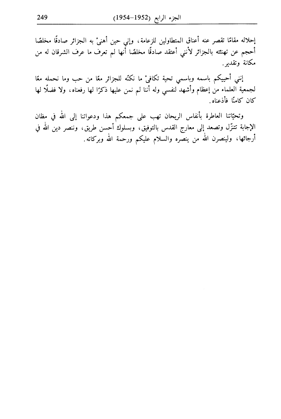 إنني أحييكم باسمه وباسمي تحية تكافئ ما نكنّه للجزائر معًا من حب وما نحمله معًا لجمعية العلماء من إعظام وأشهد لنفسي وله أننا لم نمن عليها ذكرًا لها رفعناه، ولا فضلًا لها كان كامنًا فأذعناه.