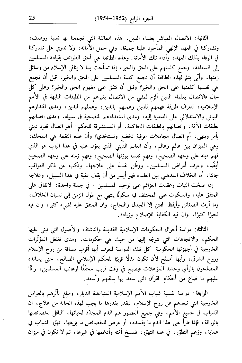 الثالثة: دراسة أحوال الحكومات الإسلامية القديمة والناشئة، والأصول التي تبني عليها الحكم، والاتجاهات التي تتوجّه إليها من حيث هي حكومات، ومدى تغلغل المؤثّرات الخارجية في أجهزتها الحكومية. كل تلك الدراسة لنعرف أيها أقرب مسافة من روح الإسلام وروح الشرق، وأيها أصلح لأن تكون مثالًا قريبًا للحكم الإسلامي الصالح، حتى يسانده المصلحون بالرأي وحشد المؤهلات فيصبح في وقت قريب محقّقًا لرغائب المسلمين، رادًّا عليهم ما ضاع من أحكام القرآن التي سعد بها سلفهم وأسعد.
