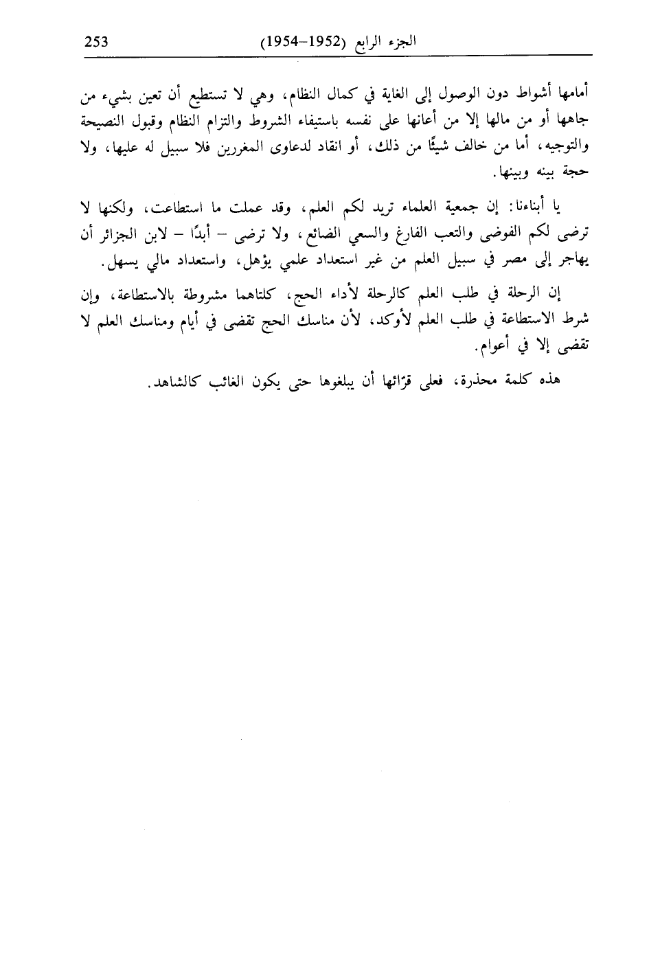 يا أبناءنا: إن جمعية العلماء تريد لكم العلم، وقد عملت ما استطاعت، ولكنها لا ترضى لكم الفوضى والتعب الفارغ والسعي الضائع، ولا ترضى- أبدًا- لابن الجزائر أن يهاجر إلى مصر في سبيل العلم من غير استعداد علمي يؤهل، واستعداد مالي يسهل.