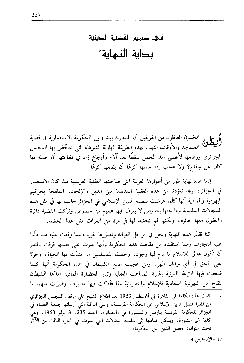 * كتبت هذه الكلمة في القاهرة في أغسطس 1933 بعد اطلاع الشيخ على موقف المجلس الجزائري من قضية فصل الدين الإسلامي عن الحكومة الفرنسية، وعلى البرقية التي أرسلتها جمعية العلماء في الجزائر للحكومة الفرنسية بباريس والمنشورة في «البصائر»، العدد 235، 3 يوليو 1953، وهي كلمة غير منشورة، ويمكن إضافتها إلى سلسلة المقالات التي نشرت في الجزء الثالث من الآثار تحت عنوان: "فصل الدين عن الحكومة".