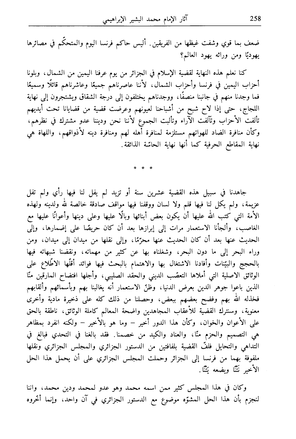 جاهدنا في سبيل هذه القضية عشرين سنة أو تزيد لم يفل لنا فيها رأي ولم تفل عزيمة، ولم يكل لنا فيها قلم ولا لسان ووقفنا فيها مواقف صادقة خالصة لله ولدينه ولهذه الأمة التي كتب الله عليها أن يكون بعض أبنائها وبالًا عليها وعلى دينها وأعوانًا عليها مع الغاصب، وألجأنا الاستعمار مرات إلى إبرازها بعد أن كان حريصًا على إضمارها، وإلى الحديث عنها بعد أن كان الحديث عنها محرّمًا، وإلى نقلها من ميدان إلى ميدان، ومن وراء البحر إلى ما دون البحر، وشغلناه بها عن كثير من مهماته، ونقضنا شبهاته فيها بالحجج والبيّنات وأفادنا الاشتغال بها والاهتمام بالبحث فيها فوائد أقلّها الاطّلاع على الوثائق الأصلية التي أملاها التعصب الديني والحقد الصليبي، وأجلها افتضاح المارقين منّا الذين باعوا جوهر الدين بعرض الدنيا، وظنّ الاستعمار أنه يغالبنا بهم وبأسمائهم وألقابهم فخذله الله بهم وفضح بعضهم ببعض، وحصلنا من ذلك كله على ذخيرة مادية وأخرى معنوية، وسنترك القضية للأعقاب المجاهدين واضحة المعالم كاملة الوثائق، ناطقة بالحق على الأعوان والخوان، وكأن هذا الدور أخير- وما هو بالأخير- ولكنه انفرد بمظاهر هي التصميم والحزم منّا، والعناد والكيد من خصمنا. فقد بالغنا في التحدي فبالغ في التداهي والتحايل فلفّ القضية بلفافتين من الدستور الجزائري والمجلس الجزائري ونقلها ملفوفة بهما من فرنسا إلى الجزائر وحملت المجلس الجزائري على أن يحمل هذا الحل الأخير نَتْنًا ويضعه يَتْنًا.