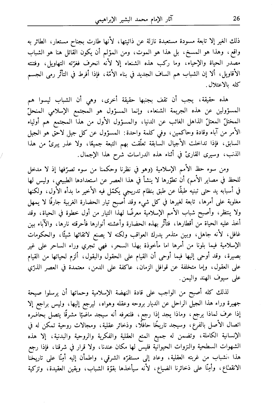 لذلك كله أصبح من الواجب على قادة النهضة الإسلامية وحماتها أن يرسلوا صيحة جهيرة وراء هذا الجيل الراحل عن الديار بروحه وعقله وهواه، ليرجع إليها، وليس براجع إلا إذا عرف لماذا يرجع، وماذا يجد إذا رجع، فلنعرفه أنه سيجد ماضيًا مشرقًا يتصل بحاضره اتصال الأصل بالفرع، وسيجد تاريخًا حافلًا، وذخائر عقلية، ومجالات روحية تمكن له في الإنسالية الكاملة، وتضمن له جميع المتع العقلية والفكرية والروحية والبدنية، إلا هذه الشهوات السطحية والنزوات الحيوانية فليس لها مكان عندنا، ولا قرار في شرقنا، فإذا رجع هذا الشباب من غربته العقلية، وعاد إلى مستقرّه الشرقي، واطمأن إليه أمِنّا على تاريخنا الانقطاع، وأمِنّا على ذخائرنا الضياع، لأنه سيأخذها بقوّة الشباب، ويقين العقيدة، وتزكية