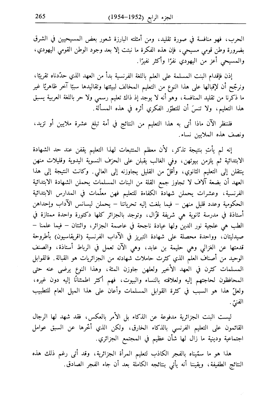 هذا هو ما سمّيناه بالفجر الكاذب لتعليم المرأة الجزائرية، وقد أتى رغم ذلك هذه النتائج الطفيفة، ويقيننا أنه يأتي بنتائجه الكاملة بعد أن جاء الفجر الصادق.