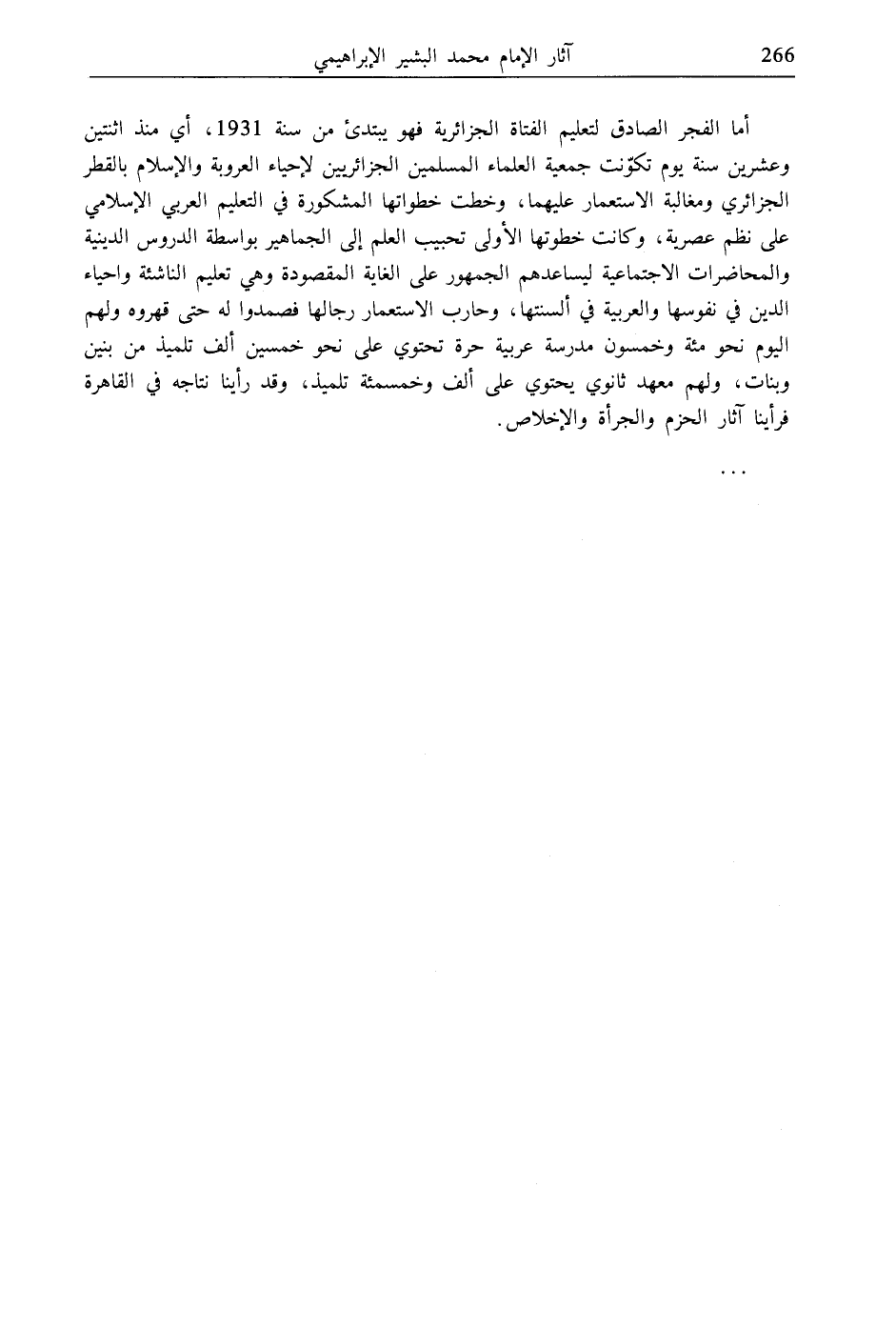 أما الفجر الصادق لتعليم الفتاة الجزائرية فهو يبتدئ من سنة 1931، أي منذ اثنتين وعشرين سنة يوم تكوّنت جمعية العلماء المسلمين الجزائريين لإحياء العروبة والإسلام بالقطر الجزائري ومغالبة الاستعمار عليهما، وخطت خطواتها المشكورة في التعليم العربي الإسلامي على نظم عصرية، وكانت خطوتها الأولى تحبيب العلم إلى الجماهير بواسطة الدروس الدينية والمحاضرات الاجتماعية ليساعدهم الجمهور على الغاية المقصودة وهي تعليم الناشئة وإحياء الدين في نفوسها والعربية في ألسنتها، وحارب الاستعمار رجالها فصمدوا له حتى قهروه ولهم اليوم نحو مئة وخمسون مدرسة عربية حرة تحتوي على نحو خمسين ألف تلميذ من بنين وبنات، ولهم معهد ثانوي يحتوي على ألف وخمسمئة تلميذ، وقد رأينا نتاجه في القاهرة فرأينا آثار الحزم والجرأة والإخلاص.