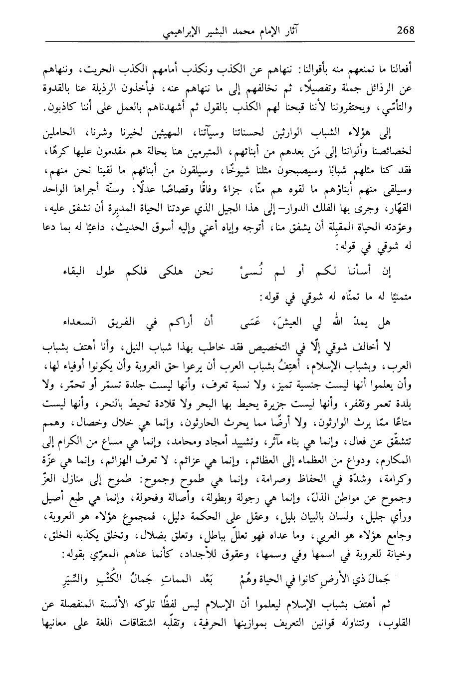 لا أخالف شوقي إلّا في التخصيص فقد خاطب بهذا شباب النيل، وأنا أهتف بشباب العرب، وبشباب الإسلام، أهتِفُ بشباب العرب أن يرعوا حق العروبة وأن يكونوا أوفياء لها، وأن يعلموا أنها ليست جنسية تميز، ولا نسبة تعرف، وأنها ليست جلدة تسمّر أو تحمّر، ولا بلدة تعمر وتقفر، وأنها ليست جزيرة يحيط بها البحر ولا قلادة تحيط بالنحر، وأنها ليست متاعًا ممّا يرث الوارثون، ولا أرضًا مما يحرث الحارثون، وإنما هي خلال وخصال، وهمم تتشقّق عن فعال، وإنما هي بناء مآثر، وتشييد أمجاد ومحامد، وإنما هي مساع من الكرام إلى المكارم، ودواع من العظماء إلى العظائم، وإنما هي عزائم، لا تعرف الهزائم، وإنما هي عزّة وكرامة، وشدّة في الحفاظ وصرامة، وإنما هي طموح وجموح: طموح إلى منازل العزّ وجموح عن مواطن الذلّ، وإنما هي رجولة وبطولة، وأصالة وفحولة، وإنما هي طبع أصيل ورأي جليل، ولسان بالبيان بليل، وعقل على الحكمة دليل، فمجموع هؤلاء هو العروبة، وجامع هؤلاء هو العربي، وما عداه فهو تعللّ بباطل، وتعلق بضلال، وتخلق يكذبه الخلق، وخيانة للعروبة في اسمها وفي وسمها، وعقوق للأجداد، كأنما عناهم المعزي بقوله: