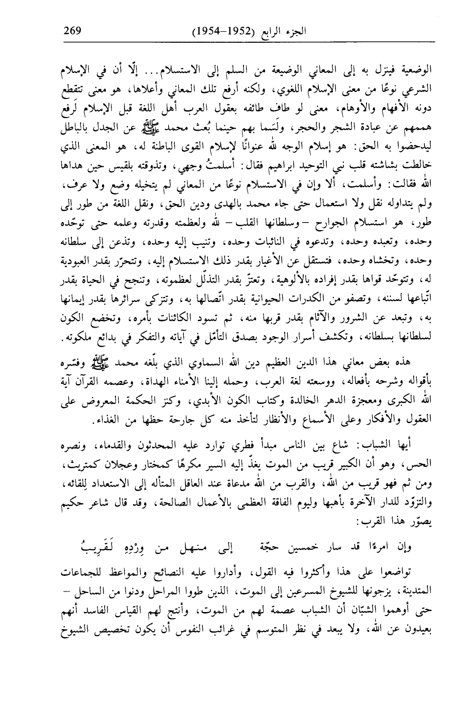 الوضعية فينزل به إلى المعاني الوضيعة من السلم إلى الاستسلام ... إلّا أن في الإسلام الشرعي نوعًا من معنى الإسلام اللغوي، ولكنه أرفع تلك المعاني وأعلاها، هو معنى تتقطع دونه الأفهام والأوهام، معنى لو طاف طائفه بعقول العرب أهل اللغة قبل الإسلام لَرفع هممهم عن عبادة الشجر والحجر، ولَسَما بهم حينما بُعث محمد - صلى الله عليه وسلم - عن الجدل بالباطل ليدحضوا به الحق: هو إسلام الوجه لله عنوانًا لإسلام القوى الباطنة له، هو المعنى الذي خالطت بشاشته قلب نبي التوحيد إبراهيم فقال: أسلمتُ وجهي، وتذوقته بلقيس حين هداها الله فقالت: وأسلمت، ألا وإن في الاستسلام نوعًا من المعاني لم يتخيله وضع ولا عرف، ولم يتداوله نقل ولا استعمال حتى جاء محمد بالهدى ودين الحق، ونقل اللغة من طور إلى طور، هو استسلام الجوارح- وسلطانها القلب- لله ولعظمته وقدرته وعلمه حتى توحّده وحده، وتعبده وحده، وتدعوه في النائبات وحده، وتنيب إليه وحده، وتذعن إلى سلطانه وحده، وتخشاه وحده، فتستقل عن الأغيار بقدر ذلك الاستسلام إليه، وتتحرّر بقدر العبودية له، وتتوحّد قواها بقدر إفراده بالألوهية، وتعتزّ بقدر التذلّل لعظموته، وتنجح في الحياة بقدر اتباعها لسننه، وتصفو من الكدرات الحيوانية بقدر اتّصالها به، وتتزكى سرائرها بقدر إيمانها به، وتبعد عن الشرور والآثام بقدر قربها منه، ثم تسود الكائنات بأمره، وتخضع الكون لسلطانها بسلطانه، وتكشف أسرار الوجود بصدق التأمّل في آياته والتفكر في بدائع ملكوته.