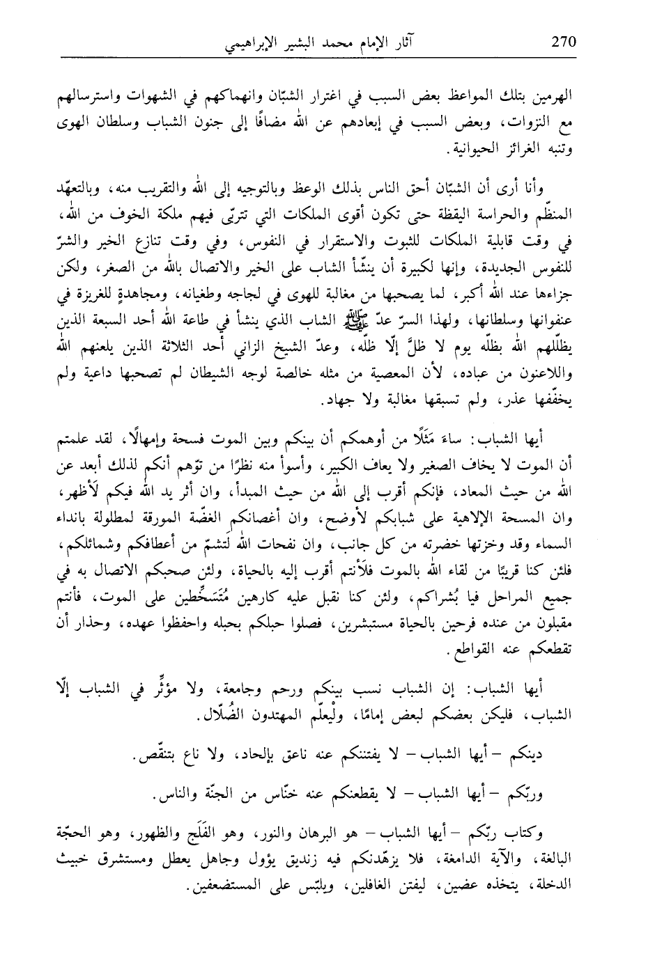 أيها الشباب: إن الشباب نسب بينكم ورحم وجامعة، ولا مؤثِّر في الشباب إلّا الشباب، فليكن بعضكم لبعض إمامًا، وئيعلّم المهتدون الضُلّال.