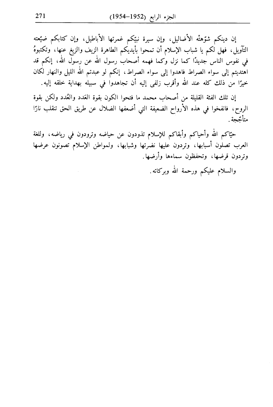 إن دينكم شوّهتْه الأضاليل، وإن سيرة نبيّكم غمرتها الأباطيل، وإن كتابكم ضيّعته التآويل، فهل لكم يا شباب الإسلام أن تمحوا بأيديكم الطاهرة الزيف والزيغ عنها، وتكتبوهُ في نفوس الناس جديدًا كما نزل وكما فهمه أصحاب رسول الله عن رسول الله، إنكم قد اهتديتم إلى سواء الصراط فاهدوا إلى سواء الصراط، إنكم لو عبدتم الله الليل والنهار لكان خيرًا من ذلك كله عند الله وأقرب زلفى إليه أن تجاهدوا في سبيله بهداية خلقه إليه.