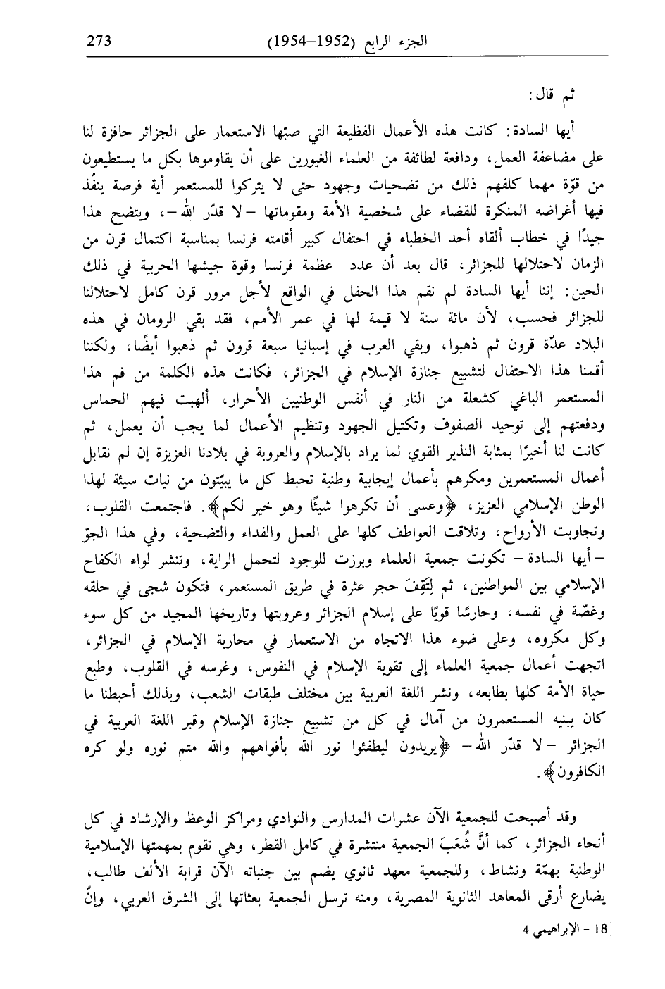أيها السادة: كانت هذه الأعمال الفظيعة التي صبّها الاستعمار على الجزائر حافزة لنا على مضاعفة العمل، ودافعة لطائفة من العلماء الغيورين على أن يقاوموها بكل ما يستطيعون من قوّة مهما كلفهم ذلك من تضحيات وجهود حتى لا يتركوا للمستعمر أية فرصة ينفذ فيها أغراضه المنكرة للقضاء على شخصية الأمة ومقوماتها- لا قدّر الله-، ويتضح هذا جيدًا في خطاب ألقاه أحد الخطباء في احتفال كبير أقامته فرنسا بمناسبة اكتمال قرن من الزمان لاحتلالها للجزائر، قال بعد أن عدد عظمة فرنسا وقوة جيشها الحربية في ذلك الحين: إننا أيها السادة لم نقم هذا الحفل في الواقع لأجل مرور قرن كامل لاحتلالنا للجزائر فحسب، لأن مائة سنة لا قيمة لها في عمر الأمم، فقد بقي الرومان في هذه البلاد عدّة قرون ثم ذهبوا، وبقي العرب في إسبانيا سبعة قرون ثم ذهبوا أيضًا، ولكننا أقمنا هذا الاحتفال لتشييع جنازة الإسلام في الجزائر، فكانت هذه الكلمة من فم هذا المستعمر الباغي كشعلة من النار في أنفس الوطنيين الأحرار، ألهبت فيهم الحماس ودفعتهم إلى توحيد الصفوف وتكتيل الجهود وتنظيم الأعمال لما يجب أن يعمل، ثم كانت لنا أخيرًا بمثابة النذير القوي لما يراد بالإسلام والعروبة في بلادنا العزيزة إن لم نقابل أعمال المستعمرين ومكرهم بأعمال إيجابية وطنية تحبط كل ما يبيّتون من نيات سيئة لهذا الوطن الإسلامي العزيز، {وَعَسَى أَنْ تَكْرَهُوا شَيْئًا وَهُوَ خَيْرٌ لَكُمْ}. فاجتمعت القلوب، وتجاوبت الأرواح، وتلاقت العواطف كلها على العمل والفداء والتضحية، وفي هذا الجوّ - أيها السادة- تكونت جمعية العلماء وبرزت للوجود لتحمل الراية، وتنشر لواء الكفاح الإسلامي بين المواطنين، ثم لِتَقِفَ حجر عثرة في طريق المستعمر، فتكون شجى في حلقه وغصّة في نفسه، وحارسًا قويًا على إسلام الجزائر وعروبتها وتاريخها المجيد من كل سوء وكل مكروه، وعلى ضوء هذا الاتجاه من الاستعمار في محاربة الإسلام في الجزائر، اتجهت أعمال جمعية العلماء إلى تقوية الإسلام في النفوس، وغرسه في القلوب، وطبع حياة الأمة كلها بطابعه، ونشر اللغة العربية بين مختلف طبقات الشعب، وبذلك أحبطنا ما كان يبنيه المستعمرون من آمال في كل من تشييع جنازة الإسلام وقبر اللغة العربية في الجزائر- لا قدّر الله- {يُرِيدُونَ لِيُطْفِئُوا نُورَ اللَّهِ بِأَفْوَاهِهِمْ وَاللَّهُ مُتِمُّ نُورِهِ وَلَوْ كَرِهَ ائكَافِرُونَ}.