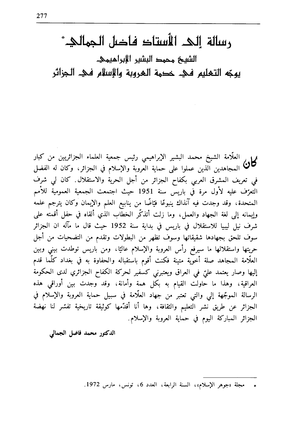 كان العلّامة الشيخ محمد البشير الإبراهيمي رئيس جمعية العلماء الجزائريين من كبار المجاهدين الذين عملوا على حماية العروبة والإسلام في الجزائر، وكان له الفضل في تعريف المشرق العربي بكفاح الجزائر من أجل الحرية والاستقلال. كان لي شرف التعرّف عليه لأول مرة في باريس سنة 1951 حيث اجتمعت الجمعية العمومية للأمم المتحدة، وقد وجدت فيه آنذاك ينبوعًا فيّاضًا من ينابيع العلم والإيمان وكان يترجم علمه وإيمانه إلى لغة الجهاد والعمل، وما زلت أتذكّر الخطاب الذي ألقاه في حفل أقمته على شرف نيل ليبيا للاستقلال في باريس في بداية سنة 1952 حيث قال ما مآله ان الجزائر سوف تلحق بجهادها شقيقاتها وسوف تظهر من البطولات وتقدم من التضحيات من أجل حريتها واستقلالها ما سيرفع رأس العروبة والإسلام عاليًا، ومن باريس توطدت بيني وبين العلّامة المجاهد صلة أخوية متينة فكنت أقوم باستقباله والحفاوة به في بغداد كلّما قدم إليها وصار يعتمد عليّ في العراق ويعتبرني كسفير لحركة الكفاح الجزائري لدى الحكومة العراقية، وهذا ما حاولت القيام به بكل همة وأمانة، وقد وجدت بين أوراقي هذه الرسالة الموجّهة إلي والتي تعتبر من جهاد العلّامة في سبيل حماية العروبة والإسلام في الجزائر عن طريق نشر التعليم والثقافة، وها أنا أقدّمها كوثيقة تاريخية تفسّر لنا نهضة الجزائر المباركة اليوم في حماية العروبة والإسلام.