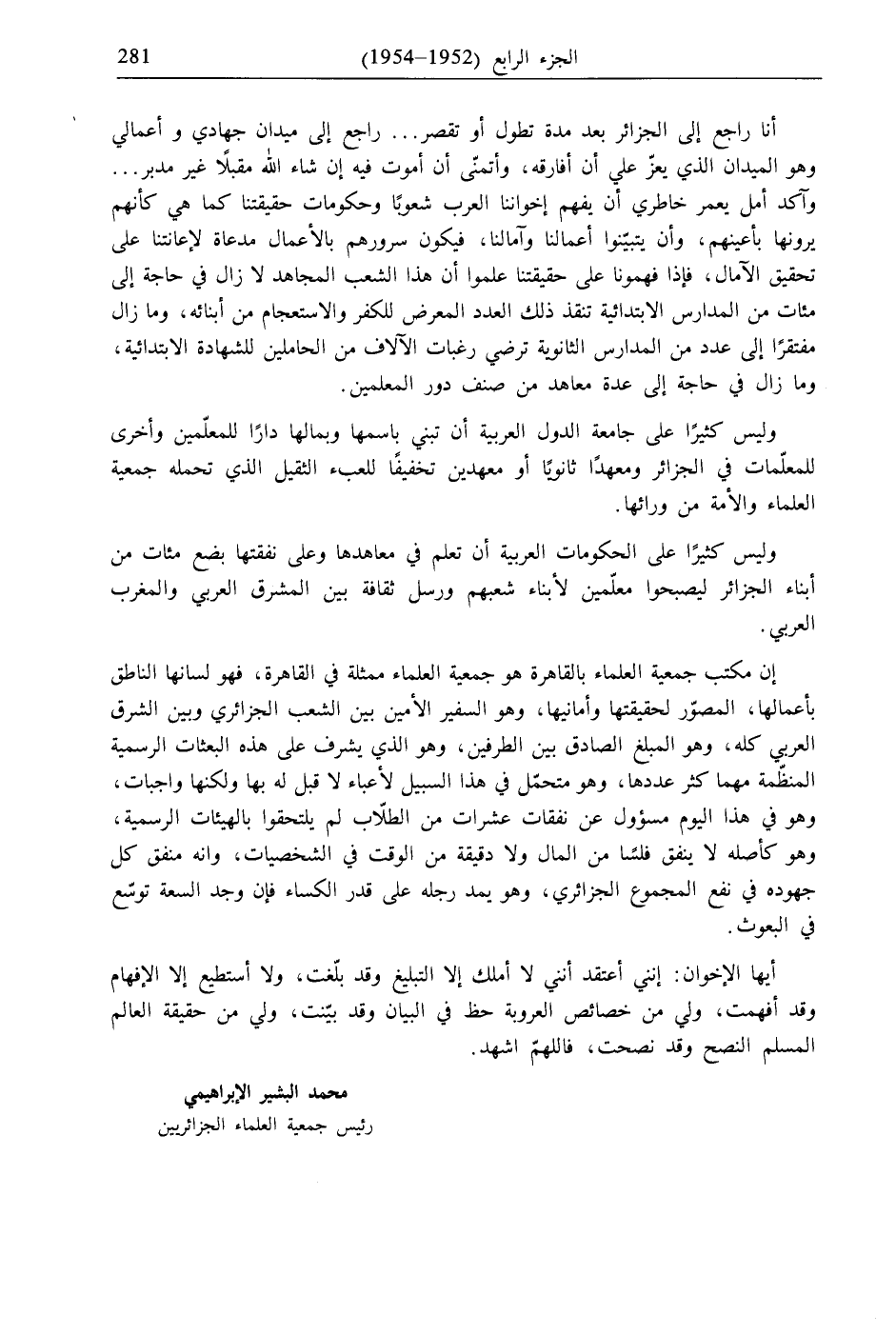 أنا راجع إلى الجزائر بعد مدة تطول أو تقصر ... راجع إلى ميدان جهادي وأعمالي وهو الميدان الذي يعزّ علي أن أفارقه، وأتمنّى أن أموت فيه إن شاء الله مقبلًا غير مدبر ... وآكد أمل يعمر خاطري أن يفهم إخواننا العرب شعوبًا وحكومات حقيقتنا كما هي كأنهم يرونها بأعينهم، وأن يتبيّنوا أعمالنا وآمالنا، فيكون سرورهم بالأعمال مدعاة لإعانتنا على تحقيق الآمال، فإذا فهمونا على حقيقتنا علموا أن هذا الشعب المجاهد لا زال في حاجة إلى مئات من المدارس الابتدائية تنقذ ذلك العدد المعرض للكفر والاستعجام من أبنائه، وما زال مفتقرًا إلى عدد من المدارس الثانوية ترضي رغبات الآلاف من الحاملين للشهادة الابتدائية، وما زال في حاجة إلى عدة معاهد من صنف دور المعلمين.