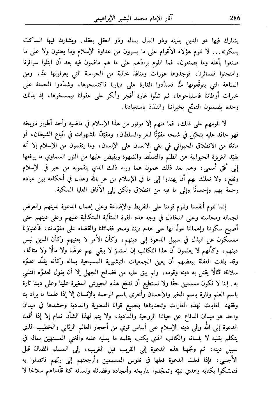 إنما نلوم أنفسنا ونلوم قومنا على التفريط والإضاعة وعلى إهمال الدعوة لدينهم والعرض لجماله ومحاسنه وعلى التخاذل في وجه هذه القوة المتألبة المتكالبة عليهم وعلى دينهم حتى أصبح سكوتنا وإهمالنا عونًا لها على هدم ديننا ومحو فضائلنا والقضاء على مقوّماتنا، فأغنياؤنا ممسكون عن البذل في سبيل الدعوة إلى دينهم، وكأن الأمر لا يعنيهم وكأن الدين ليس دينهم، وكأنهم لا يعلمون أن هذا التكالب إن استمرّ لا يبقي لهم عرضًا ولا مالًا ولا متاعًا، وقد بلغت الغفلة ببعضهم أن يعين الجمعيات التبشيرية المسيحية بماله وكأنه يقلّد عدوّه سلاحًا قتّالًا يقتل به دينه وقومه، ولم يبق عليه من فضائح الجهل إلا أن يقول لعدوّه اقتلنى به. إننا لا نكون مسلمين حقًا ولا نستطيع أن ندفع هذه الجيوش المغيرة علينا وعلى ديننا تارة باسم العلم وتارة باسم الخير والإحسان وأخرى باسم الرحمة بالإنسان إلا إذا علمنا ما يراد بنا وفقهنا الغايات لهذه الغارات وتحديناها بجميع قوانا المعنوية والمادية وحشدها في ميدان واحد هو ميدان الدفاع عن حياتنا الروحية والمادية، ولا يتم لهذا الشأن تمام إلا إذا أقمنا الدعوة إلى الله وإلى دينه الإسلام على أساس قوي من أحجار العالم الربّاني والخطيب الذي يتكلم بقلبه لا بلسانه والكاتب الذي يكتب بقلمه ما يمليه عقله والغني المستهين بماله في سبيل دينه، ثم وجّهنا هذه الدعوة إلى القريب قبل الغريب، إلى المسلم الضالّ قبل الأجنبي، فإذا فعلت الدعوة فعلها في نفوس المسلمين وأرجعتهم إلى ربّهم فاتصلوا به فتمسّكوا بكتابه وهدي نبيّه وتمجّدوا بتاريخه وأمجاده وفضائله ولسانه كنا قلّدناهم سلاحًا لا
