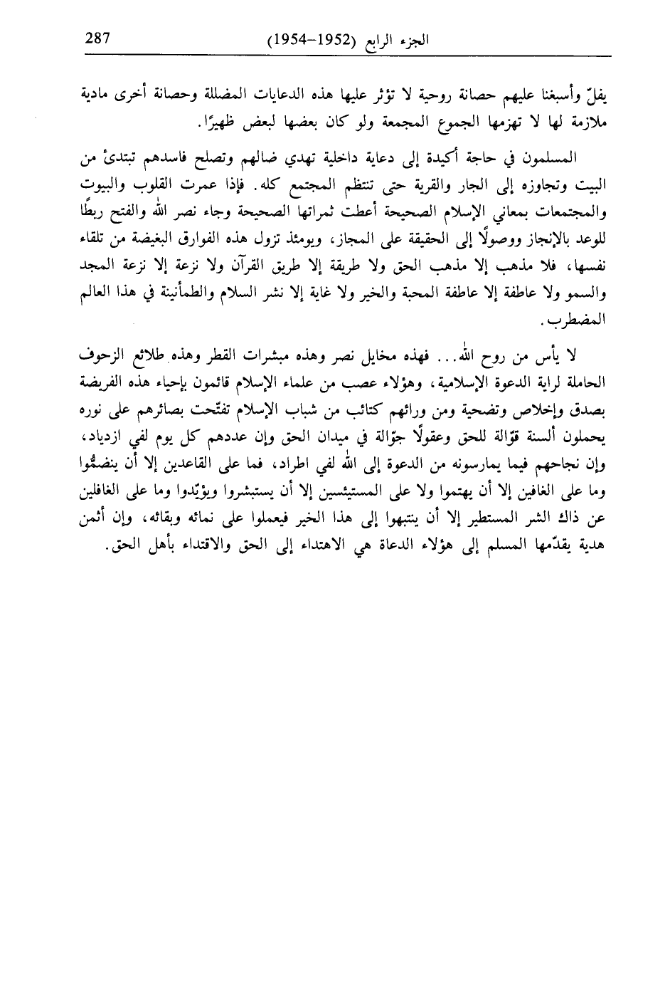 لا يأس من روح الله ... فهذه مخايل نصر وهذه مبشرات القطر وهذه طلائع الزحوف الحاملة لراية الدعوة الإسلامية، وهؤلاء عصب من علماء الإسلام قائمون بإحياء هذه الفريضة بصدق وإخلاص وتضحية ومن ورائهم كتائب من شباب الإسلام تفتّحت بصائرهم على نوره يحملون ألسنة قوّالة للحق وعقولًا جوّالة في ميدان الحق وإن عددهم كل يوم لفي ازدياد، وإن نجاحهم فيما يمارسونه من الدعوة إلى الله لفي اطراد، فما على القاعدين إلا أن ينضمُّوا وما على الغافين إلا أن يهتموا ولا على المستيئسين إلا أن يستبشروا ويؤيّدوا وما على الغافلين عن ذاك الشر المستطير إلا أن ينتبهوا إلى هذا الخير فيعملوا على نمائه وبقائه، وإن أثمن هدية يقدّمها المسلم إلى هؤلاء الدعاة هي الاهتداء إلى الحق والاقتداء بأهل الحق.