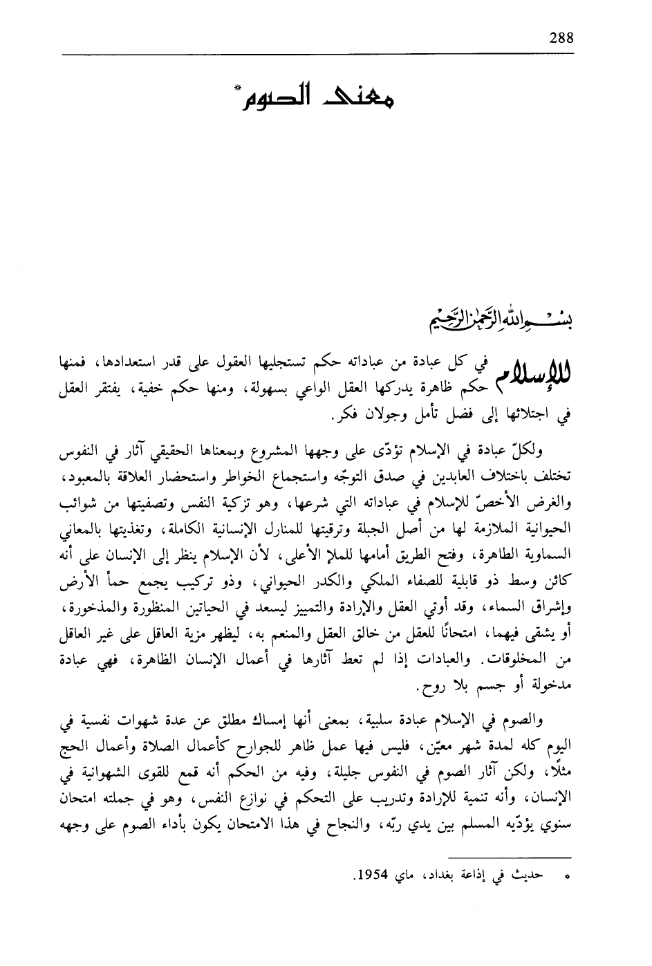 والصوم في الإسلام عبادة سلبية، بمعنى أنها إمساك مطلق عن عدة شهوات نفسية في اليوم كله لمدة شهر معيّن، فليس فيها عمل ظاهر للجوارح كأعمال الصلاة وأعمال الحج مثلًا، ولكن آثار الصوم في النفوس جليلة، وفيه من الحكم أنه قمع للقوى الشهوانية في الإنسان، وأنه تنمية للإرادة وتدريب على التحكم في نوازع النفس، وهو في جملته امتحان سنوي يؤدّيه المسلم بين يدي ربّه، والنجاح في هذا الامتحان يكون بأداء الصوم على وجهه