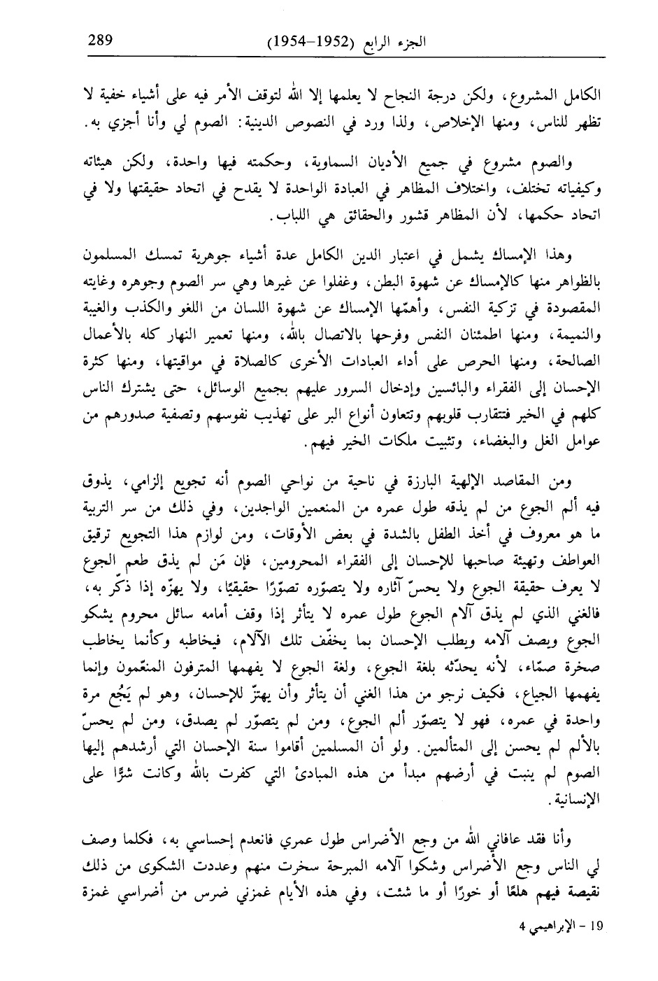 ومن المقاصد الإلهية البارزة في ناحية من نواحي الصوم أنه تجويع إلزامي، يذوق فيه ألم الجوع من لم يذقه طول عمره من المنعمين الواجدين، وفي ذلك من سر التربية ما هو معروف في أخذ الطفل بالشدة في بعض الأوقات، ومن لوازم هذا التجويع ترقيق العواطف وتهيئة صاحبها للإحسان إلى الفقراء المحرومين، فإن مَن لم يذق طعم الجوع لا يعرف حقيقة الجوع ولا يحسّ آثاره ولا يتصوّره تصوّرًا حقيقيًا، ولا يهزّه إذا ذكّر به، فالغي الذي لم يذق آلام الجوع طول عمره لا يتأثر إذا وقف أمامه سائل محروم يشكو الجوع ويصف آلامه ويطلب الإحسان بما يخفّف تلك الآلام، فيخاطبه وكأنما يخاطب صخرة صمّاء، لأنه يحدّثه بلغة الجوع، ولغة الجوع لا يفهمها المترفون المنعّمون وإنما يفهمها الجياع، فكيف نرجو من هذا الغي أن يتأثر وأن يهتزّ للإحسان، وهو لم يَجُع مرة واحدة في عمره، فهو لا يتصوّر ألم الجوع، ومن لم يتصوّر لم يصدق، ومن لم يحسّ بالألم لم يحسن إلى المتألمين. ولو أن المسلمين أقاموا سنة الإحسان التي أرشدهم إليها الصوم لم ينبت في أرضهم مبدأ من هذه المبادئ التي كفرت بالله وكانت شرًّا على الإنسانية.