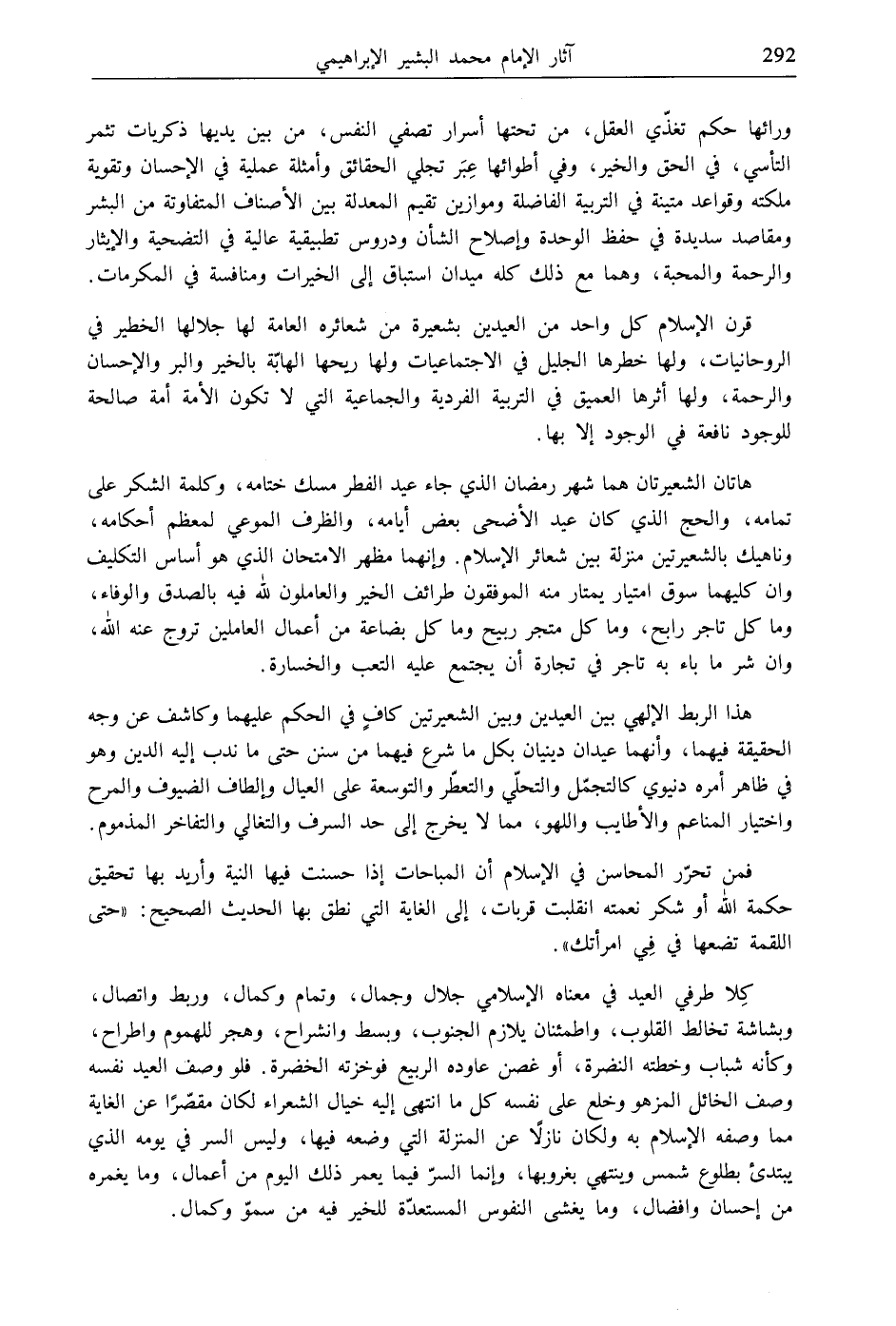 قرن الإسلام كل واحد من العيدين بشعيرة من شعائره العامة لها جلالها الخطير في الروحانيات، ولها خطرها الجليل في الاجتماعيات ولها ريحها الهابّة بالخير والبر والإحسان والرحمة، ولها أثرها العميق في التربية الفردية والجماعية التي لا تكون الأمة أمة صالحة للوجود نافعة في الوجود إلا بها.
