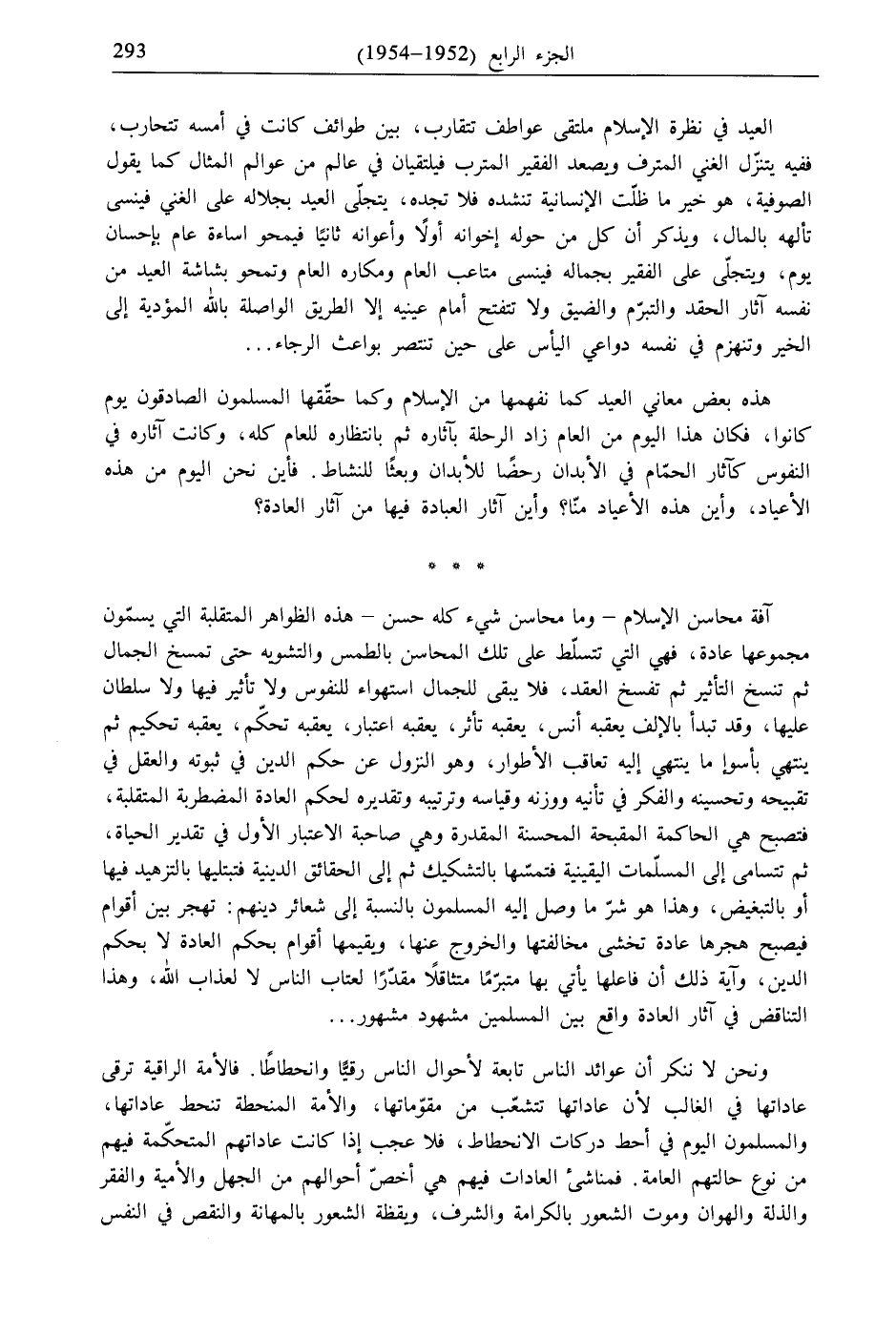 آفة محاسن الإسلام- وما محاسن شيء كله حسن- هذه الظواهر المتقلبة التي يسمّون مجموعها عادة، فهي التي تتسلّط على تلك المحاسن بالطمس والتشويه حتى تمسخ الجمال ثم تنسخ التأثير ثم تفسخ العقد، فلا يبقى للجمال استهواء للنفوس ولا تأثير فيها ولا سلطان عليها، وقد تبدأ بالإلف يعقبه أنس، يعقبه تأثر، يعقبه اعتبار، يعقبه تحكّم، يعقبه تحكيم ثم ينتهي بأسوإ ما ينتهي إليه تعاقب الأطوار، وهو النزول عن حكم الدين في ثبوته والعقل في تقبيحه وتحسينه والفكر في تأنيه ووزنه وقياسه وترتيبه وتقديره لحكم العادة المضطربة المتقلبة، فتصبح هي الحاكمة المقبحة المحسنة المقدرة وهي صاحبة الاعتبار الأول في تقدير الحياة، ثم تتسامى إلى المسلّمات اليقينية فتمسّها بالتشكيك ثم إلى الحقائق الدينية فتبتليها بالتزهيد فيها أو بالتبغيض، وهذا هو شرّ ما وصل إليه المسلمون بالنسبة إلى شعائر دينهم: تهجر بين أقوام فيصبح هجرها عادة تخشى مخالفتها والخروج عنها، ويقيمها أقوام بحكم العادة لا بحكم الدين، وآية ذلك أن فاعلها يأتي بها متبرّمًا متثاقلًا مقدّرًا لعتاب الناس لا لعذاب الله، وهذا التناقض في آثار العادة واقع بين المسلمين مشهود مشهور ...