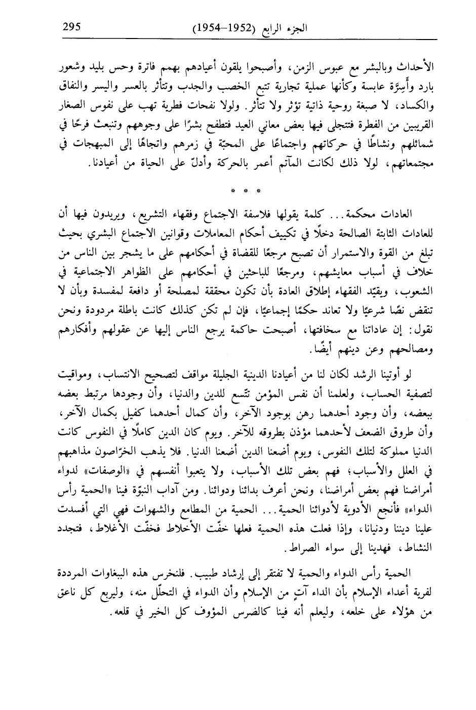 لو أوتينا الرشد لكان لنا من أعيادنا الدينية الجليلة مواقف لتصحيح الانتساب، ومواقيت لتصفية الحساب، ولعلمنا أن نفس المؤمن تتّسع للدين والدنيا، وأن وجودها مرتبط بعضه ببعضه، وأن وجود أحدهما رهن بوجود الآخر، وأن كمال أحدهما كفيل بكمال الآخر، وأن طروق الضعف لأحدهما مؤذن بطروقه للآخر. ويوم كان الدين كاملًا في النفوس كانت الدنيا مملوكة لتلك النفوس، ويوم أضعنا الدين أضعنا الدنيا. فلا يذهب الخرّاصون مذاهبهم في العلل والأسباب؛ فهم بعض تلك الأسباب، ولا يتعبوا أنفسهم في "الوصفات" لدواء أمراضنا فهم بعض أمراضنا، ونحن أعرف بدائنا ودوائنا. ومن آداب النبوّة فينا "ائحِمْيَةُ رَأْسُ الدَّوَاءِ" فأنجع الأدوية لأدوائنا الحمية ... الحمية من المطامع والشهوات فهي التي أفسدت علينا ديننا ودنيانا، وإذا فعلت هذه الحمية فعلها خفّت الأخلاط فخفّت الأغلاط، فتجدد النشاط، فهدينا إلى سواء الصراط.