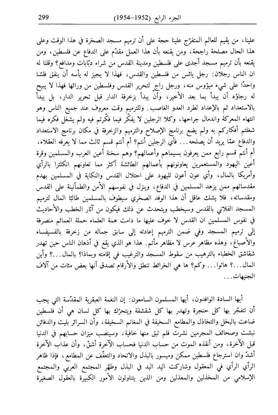 علينا، من يقيم للعالم المتفرّج علينا حجة على أن ترميم مسجد الصخرة في هذا الوقت وعلى هذا الحال مصلحة راجحة، ومن يقنعه بأن هذا العمل مقدّم على الدفاع عن فلسطين، ومن يقنعه بأن ترميم مسجد أجدى على فلسطين ومدينة القدس من شراء دبّابات ومدافع؟ وقلنا له ان الناس رجلان: رجل يائس من فلسطين والقدس، فهذا لا يجيز له يأسه أن ينفق فلسًا واحدًا على شيء ميؤوس منه، ورجل راجٍ لتحرير القدس وفلسطين من ورائها فهذا لا يبيح له رجاؤه أن يبدأ بما بعد الأخير، وأن يبدأ بزخرفة الدار قبل تحرير الدار، بل يبدأ بالاستعداد ثم بالإعداد لطرد العدو الغاصب. وللترميم وقت معروف عند جميع الناس وهو انتهاء المعركة واندمال جراحها، وكلا الرجلين لا يفكّر فيما فكّرتم فيه ولم يشغل فكره فيما شغلتم أفكاركم به ولم يضع برنامج الإصلاح والترميم والزخرفة في مكان برنامج الاستعداد والدفاع عمّا يريد أن يصلحه ... فأي الرجلين أنتم؟ أم أنتم قسم ثالث مما لا يعرفه العقلاء، أم أنتم قسم رابع ممن يعرفون بسيماهم وأعمالهم؟ وهم سخنة أعين العرب والمسلمين وقرة أعين اليهود والمستعمرين يعاونونهم بأعمالهم الطائشة أكثر مما تعاونهم انكلترا بالرأي وأمريكا بالمال، وأي عون أعون لليهود على احتلال القدس والنكاية في المسلمين بهدم مقدساتهم ممن يزهد المسلمين في الدفاع، وينزل في نفوسهم الأمن والطمأنينة على القدس ومقدساته، فلا يشك عاقل أن هذا الوفد الصخري سيطوف بالمسلمين طالبًا المال لترميم المسجد الفلاني بالقدس وسيخطب ويتحدث عن ذلك فيكون من آثار الخطب والأحاديث في نفوس المسلمين ان القدس لا خوف عليها ما دامت همة العلماء حملة العمائم منصرفة إلى ترميم المسجد وفي ضمن الترميم إعادته إلى سابق جماله من زخرفة بالفسيفساء والأصباغ، وهذه مظاهر عرس لا مظاهر مأتم. هذا هو الذي يقع في أذهان الناس حين تهدر شقاشق الخطباء بالترهيب من سقوط المسجد والترغيب في إقامته وبماذا؟ بالمال ... ؟ وأين المال ... ؟ هاتوا ... وكم؟ ها هي الخرائط تنطق والأرقام تصدق أنها بعض مئات من آلاف الجنيهات ...