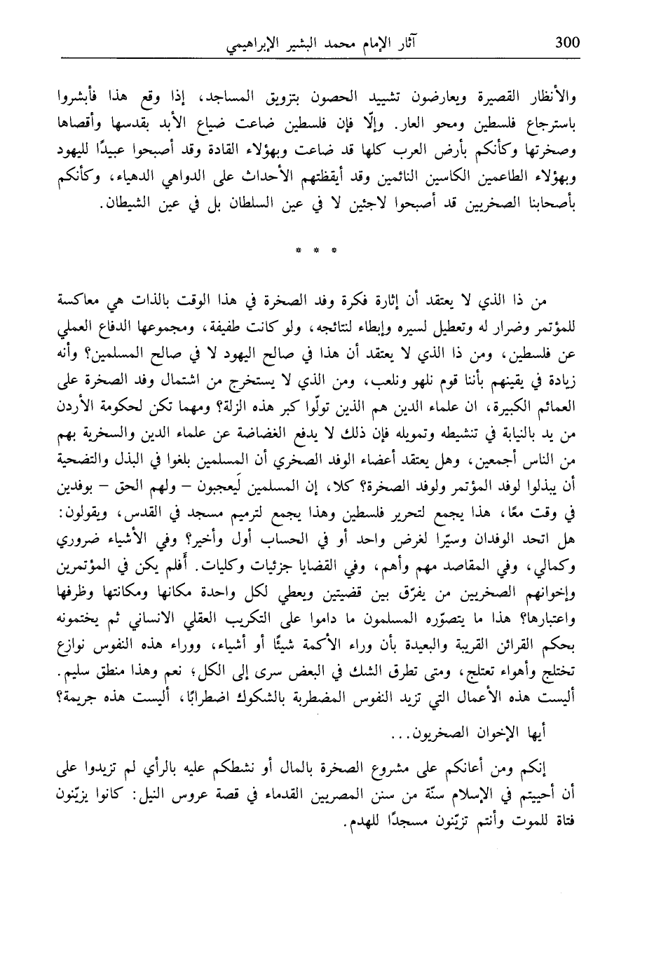 من ذا الذي لا يعتقد أن إثارة فكرة وفد الصخرة في هذا الوقت بالذات هي معاكسة للمؤتمر وضرار له وتعطيل لسيره وإبطاء لنتائجه، ولو كانت طفيفة، ومجموعها الدفاع العملي عن فلسطين، ومن ذا الذي لا يعتقد أن هذا في صالح اليهود لا في صالح المسلمين؟ وأنه زيادة في يقينهم بأننا قوم نلهو ونلعب، ومن الذي لا يستخرج من اشتمال وفد الصخرة على العمائم الكبيرة، ان علماء الدين هم الذين تولّوا كبر هذه الزلة؟ ومهما تكن لحكومة الأردن من يد بالنيابة في تنشيطه وتمويله فإن ذلك لا يدفع الغضاضة عن علماء الدين والسخرية بهم من الناس أجمعين، وهل يعتقد أعضاء الوفد الصخري أن المسلمين بلغوا في البذل والتضحية أن يبذلوا لوفد المؤتمر ولوفد الصخرة؟ كلا، إن المسلمين لَيعجبون- ولهم الحق- بوفدين في وقت معًا، هذا يجمع لتحرير فلسطين وهذا يجمع لترميم مسجد في القدس، ويقولون: هل اتحد الوفدان وسيّرا لغرض واحد أو في الحساب أول وأخير؟ وفي الأشياء ضروري وكمالي، وفي المقاصد مهم وأهم، وفي القضايا جزئيات وكليات. أَفلم يكن في المؤتمرين وإخوانهم الصخريين من يفرّق بين قضيتين ويعطي لكل واحدة مكانها ومكانتها وظرفها واعتبارها؟ هذا ما يتصوّره المسلمون ما داموا على التكريب العقلي الانساني ثم يختمونه بحكم القرائن القريبة والبعيدة بأن وراء الأكمة شيئًا أو أشياء، ووراء هذه النفوس نوازع تختلج وأهواء تعتلج، ومتى تطرق الشك في البعض سرى إلى الكل، نعم وهذا منطق سليم. أليست هذه الأعمال التي تزيد النفوس المضطربة بالشكوك اضطرابًا، أليست هذه جريمة؟