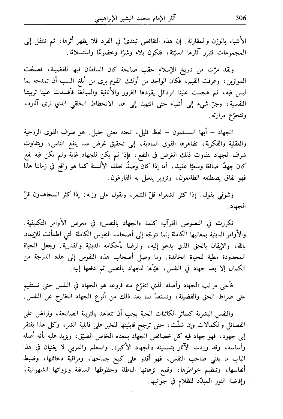 الجهاد- أيها المسلمون- لفظ قليل، تحته معنى جليل. هو صرف القوى الروحية والعقلية والفكرية، تظاهرها القوى المادية، إلى تحقيق غرض مما ينفع الناس؛ ويتفاوت شرف الجهاد بتفاوت ذلك الغرض في النفع، فإذا لم يكن للجهاد غاية ولم يكن فيه نفع كان جهدًا ضائعًا وسعيًا عقيمًا، أما إذا كان وصفًا تطلقه الألسنة كما هو واقع في زماننا هذا فهو نفاق يصطنعه الطامعون، وتزوير يتعلل به الفارغون.