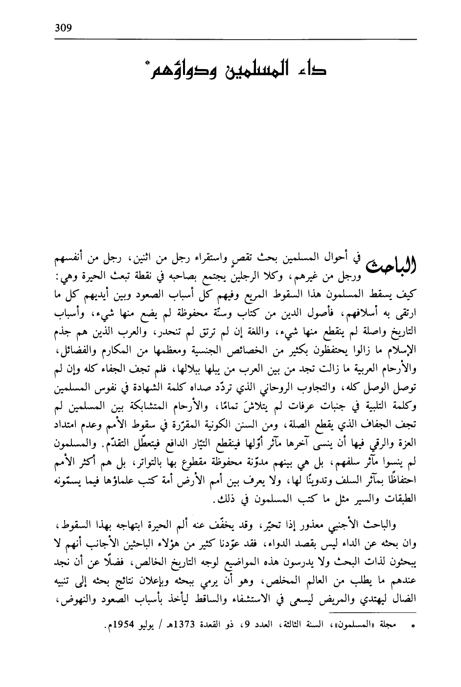 * مجلة "المسلمون "، السنة الثالثة، العدد 9، ذو القعدة 1373هـ / يوليو 1954 م.