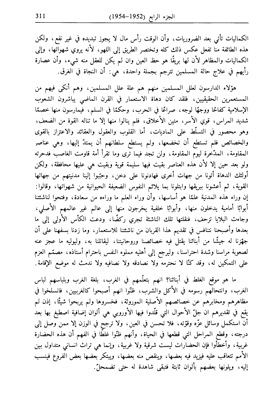 ما هو موقع الغلط في أبنائنا؟ انهم بتعلّمهم في الغرب، بلغة الغرب وبلباسهم لباس الغرب، وانتحالهم رسومه في الأكل والشرب، ظنّوا انهم أصبحوا كالغربيين، فانسلخوا في مظاهرهم ومخابرهم عن خصائصهم الأصلية الموروثة، فخسروها ولم يربحوا شيئًا، إذن لم يقع في تقديرهم ان جلّ الأحوال التي قلّدوا فيها الأوروبي هي ألوان إضافية اصطبغ بها بعد أن استكمل وسائل عزّه وقوّته، فلا تحسن في العين، ولا ترجح في الوزن إلا ممن وصل إلى درجته، وقطع المراحل التي قطعها في الحياة، وأنهم ظنّوا غلطًا في الفهم أن هذه الحضارة غربية، وأخطأوا فإن الحضارات ليست شرقية ولا غربية، وإنما هي تراث إنساني متداول بين الأمم تتعاقب عليه فيزيد فيه بعضها، وينقص منه بعضها، ويبتكر بعضها بعض الفروع فينسب إليه، ويلونها بعضهم بألوان ثابتة فتبقى شاهدة له حتى تضمحلّ.