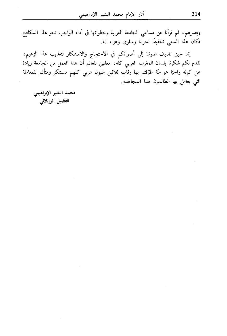 إننا حين نضيف صوتنا إلى أصواتكم في الاحتجاج والاستنكار لتعذيب هذا الزعيم، نقدم لكم شكرنا بلسان المغرب العربي كله، معلنين للعالم أن هذا العمل من الجامعة زيادة عن كونه واجبًا هو منّة طوّقتم بها رقاب ثلاثين مليون عربي كلهم مستنكر ومتألم للمعاملة التي يعامل بها الظالمون هذا المجاهد".