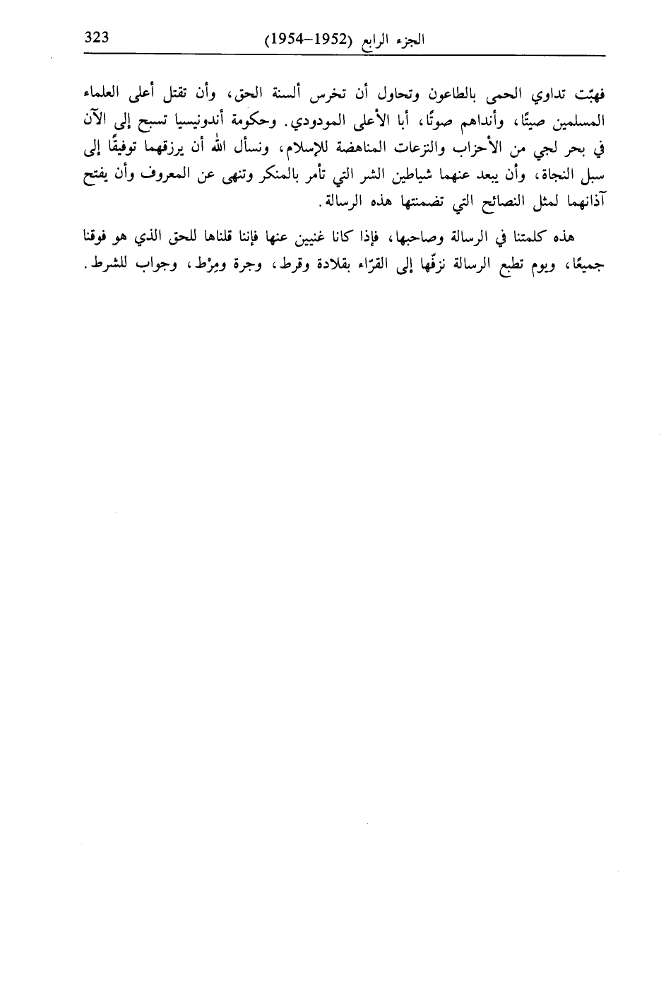 فهبّت تداوي الحمى بالطاعون وتحاول أن تخرس ألسنة الحق، وأن تقتل أعلى العلماء المسلمين صيتًا، وأنداهم صوتًا، أبا الأعلى المودودي. وحكومة أندونيسيا تسبح إلى الآن في بحر لجي من الأحزاب والنزعات المناهضة للإسلام، ونسأل الله أن يرزقهما توفيقًا إلى سبل النجاة، وأن يبعد عنهما شياطين الشر التي تأمر بالمنكر وتنهى عن المعروف وأن يفتح آذانهما لمثل النصائح التي تضمنتها هذه الرسالة.