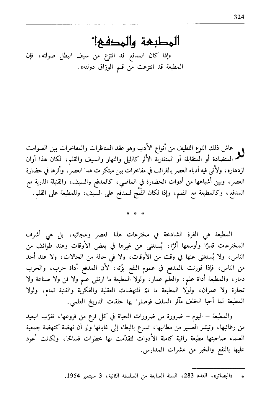 لو عاش ذلك النوع اللطيف من أنواع الأدب وهو عقد المناظرات والمفاخرات بين الصوامت المتضادة أو المتقابلة أو المتقاربة الأثر كالليل والنهار والسيف والقلم، لكان هذا أوان ازدهاره، ولأتى فيه أدباء العصر بالغرائب في مفاخرات بين مبتكرات هذا العصر، وأثرها في حضارة العصر، وبين أشباهها من أدوات الحضارة في الماضي، كالمدفع والسيف، والقنبلة الذرية مع المدفع، وكالمطبعة مع القلم، وإذا لكان الفَلْج للمدفع على السيف، وللمطبعة على القلم.