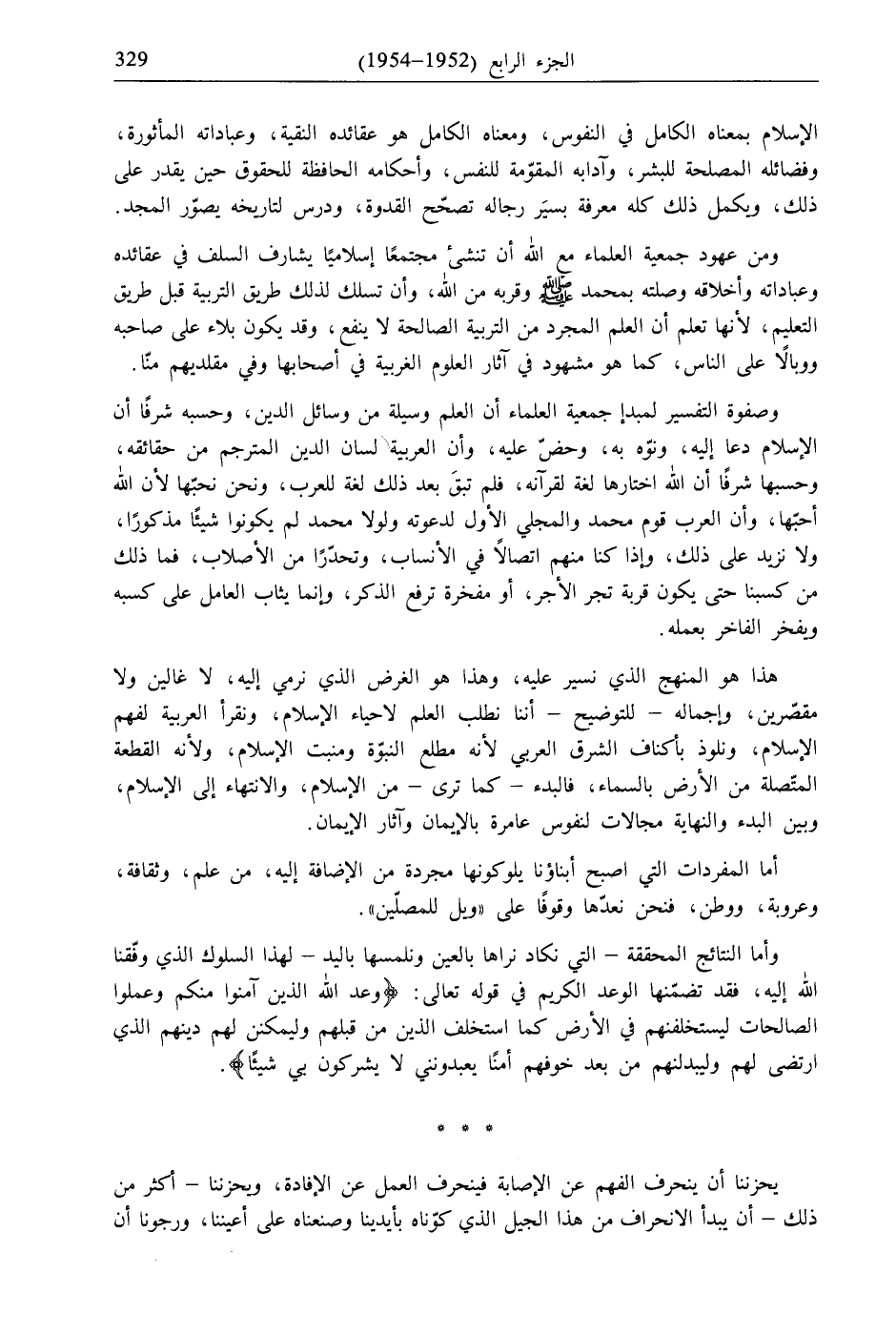 الإسلام بمعناه الكامل في النفوس، ومعناه الكامل هو عقائده النقية، وعباداته المأثورة، وفضائله المصلحة للبشر، وآدابه المقوّمة للنفس، وأحكامه الحافظة للحقوق حين يقدر على ذلك، ويكمل ذلك كله معرفة بسيَر رجاله تصحّح القدوة، ودرس لتاريخه يصوّر المجد.