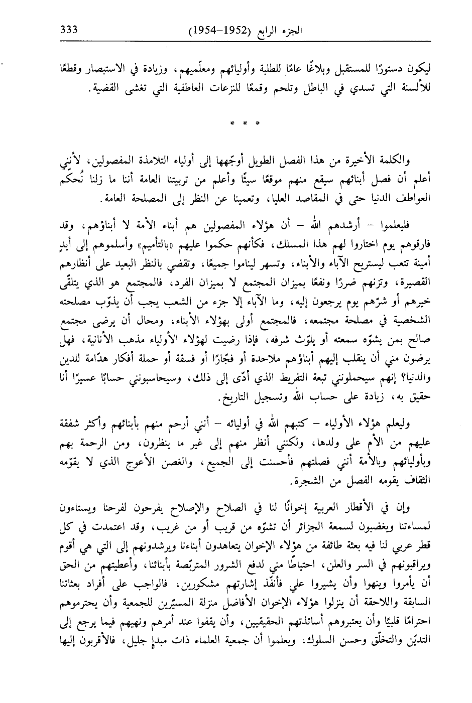 وإن في الأقطار العربية إخوانًا لنا في الصلاح والإصلاح يفرحون لفرحنا ويستاءون لمساءتنا ويغضبون لسمعة الجزائر أن تشوّه من قريب أو من غريب، وقد اعتمدت في كل قطر عربي لنا فيه بعثة طائفة من هؤلاء الإخوان يتعاهدون أبناءنا ويرشدونهم إلى التي هي أقوم ويراقبونهم في السر والعلن، احتياطًا مني لدفع الشرور المتربّصة بأبنائنا، وأعطيتهم من الحق أن يأمروا وينهوا وأن يشيروا علي فأنفّذ إشارتهم مشكورين، فالواجب على أفراد بعثاتنا السابقة واللاحقة أن ينزلوا هؤلاء الإخوان الأفاضل منزلة المسيّرين للجمعية وأن يحترموهم احترامًا قلبيًا وأن يعتبروهم أساتذتهم الحقيقيين، وأن يقفوا عند أمرهم ونهيهم فيما يرجع إلى التديّن والتخلّق وحسن السلوك، ويعلموا أن جمعية العلماء ذات مبدإٍ جليل، فالأقربون إليها