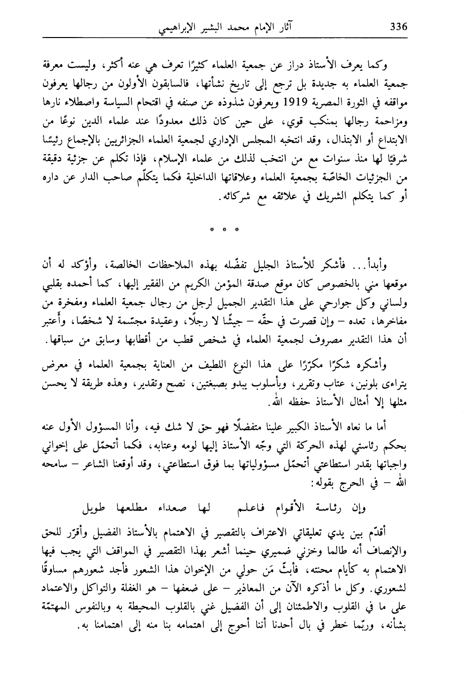 وأشكره شكرًا مكرّرًا على هذا النوع اللطيف من العناية بجمعية العلماء في معرض يتراءى بلونين، عتاب وتقرير، وبأسلوب يبدو بصبغتين، نصح وتقدير، وهذه طريقة لا يحسن مثلها إلا أمثال الأستاذ حفظه الله.