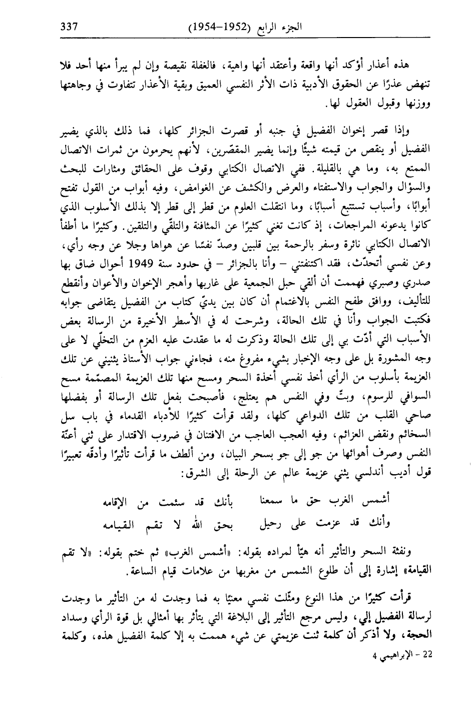 وكثيرًا ما أطفأ الاتصال الكتابي نائرة وسفر بالرحمة بين قلبين وصدّ نفسًا عن هواها وجلا عن وجه رأي، وعن نفسي أتحدّث، فقد اكتنفتني- وأنا بالجزائر- في حدود سنة 1949 أحوال ضاق بها صدري وصبري فهممت أن ألقي حبل الجمعية على غاربها وأهجر الإخوان والأعوان وأنقطع للتأليف، ووافق طفح النفس بالاغتمام أن كان بين يديّ كتاب من الفضيل يتقاضى جوابه فكتبت الجواب وأنا في تلك الحالة، وشرحت له في الأسطر الأخيرة من الرسالة بعض الأسباب التي أدّت بي إلى تلك الحالة وذكرت له ما عقدت عليه العزم من التخلّي لا على وجه المشورة بل على وجه الإخبار بشيء مفروغ منه، فجاءني جواب الأستاذ يثنيني عن تلك العزيمة بأسلوب من الرأي أخذ نفسي أخذة السحر ومسح منها تلك العزيمة المصمّمة مسح السوافي للرسوم، وبتّ وفي النفس هم يعتلج، فأصبحت بفعل تلك الرسالة أو بفضلها صاحي القلب من تلك الدواعي كلها، ولقد قرأت كثيرًا للأدباء القدماء في باب سل السخائم ونقض العزائم، وفيه العجب العاجب من الافتنان في ضروب الاقتدار على ثني أعنّة النفس وصرف أهوائها من جو إلى جو بسحر البيان، ومن ألطف ما قرأت تأثيرًا وأدقّه تعبيرًا قول أديب أندلسي يثني عزيمة عالم عن الرحلة إلى الشرق: