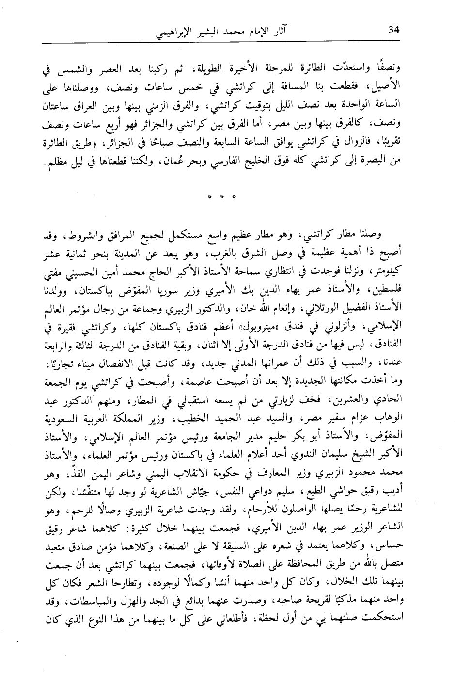 وصلنا مطار كراتشي، وهو مطار عظيم واسع مستكمل لجميع المرافق والشروط، وقد أصبح ذا أهمية عظيمة في وصل الشرق بالغرب، وهو يبعد عن المدينة بنحو ثمانية عشر كيلومتر، ونزلنا فوجدت في انتظاري سماحة الأستاذ الأكبر الحاج محمد أمين الحسيني مفتي فلسطين، والأستاذ عمر بهاء الدين بك الأميري وزير سوريا المفوّض بباكستان، وولدنا الأستاذ الفضيل الورتلاني، وإنعام الله خان، والدكتور الزبيري وجماعة من رجال مؤتمر العالم الإسلامي، وأنزلوني في فندق "ميتروبول" أعظم فنادق باكستان كلها، وكراتشي فقيرة في الفنادق، ليس فيها من فنادق الدرجة الأولى إلا اثنان، وبقية الفنادق من الدرجة الثالثة والرابعة عندنا، والسبب في ذلك أن عمرانها المدني جديد، وقد كانت قبل الانفصال ميناء تجاريًا، وما أخذت مكانتها الجديدة إلا بعد أن أصبحت عاصمة، وأصبحت في كراتشي يوم الجمعة الحادي والعشرين، فخف لزيارتي من لم يسعه استقبالي في المطار، ومنهم الدكتور عبد الوهاب عزام سفير مصر، والسيد عبد الحميد الخطيب، وزير المملكة العربية السعودية المفوّض، والأستاذ أبو بكر حليم مدير الجامعة ورئيس مؤتمر العالم الإسلامي، والأستاذ الأكبر الشيخ سليمان الندوي أحد أعلام العلماء في باكستان ورئيس مؤثمر العلماء، والأستاذ محمد محمود الزبيري وزير المعارف في حكومة الانقلاب اليمني وشاعر اليمن الفذّ، وهو أديب رقيق حواشي الطبع، سليم دواعي النفس، جيّاش الشاعرية لو وجد لها متنفّسًا، ولكن للشاعرية رحمًا يصلها الواصلون للأرحام، ولقد وجدت شاعرية الزبيري وصالًا للرحم، وهو الشاعر الوزير عمر بهاء الدين الأميري، فجمعت بينهما خلال كثيرة: كلاهما شاعر رقيق حساس، وكلاهما يعتمد في شعره على السليقة لا على الصنعة، وكلاهما مؤمن صادق متعبد متصل بالله من طريق المحافظة على الصلاة لأوقاتها، فجمعت بينهما كراتشي بعد أن جمعت بينهما تلك الخلال، وكان كل واحد منهما أنسًا وكمالًا لوجوده، وتطارحا الشعر فكان كل واحد منهما مذكيًا لقريحة صاحبه، وصدرت عنهما بدائع في الجد والهزل والمباسطات، وقد استحكمت صلتهما بي من أول لحظة، فأطلعاني على كل ما بينهما من هذا النوع الذي كان