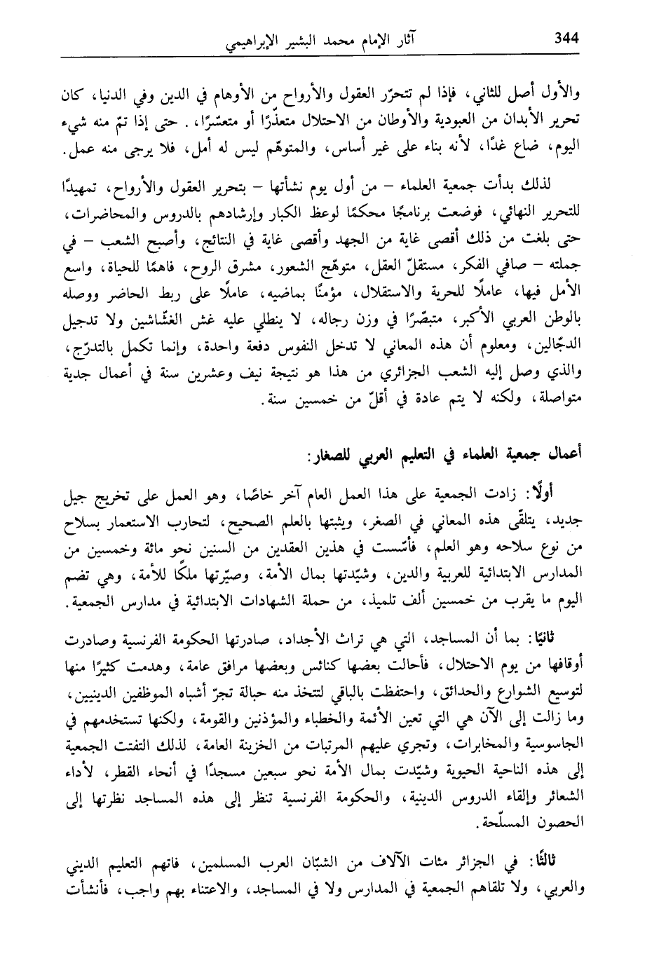 أولًا: زادت الجمعية على هذا العمل العام آخر خاصًا، وهو العمل على تخريج جيل جديد، يتلقّى هذه المعاني في الصغر، ويثبتها بالعلم الصحيح، لتحارب الاستعمار بسلاح من نوع سلاحه وهو العلم، فأسّست في هذين العقدين من السنين نحو مائة وخمسين من المدارس الابتدائية للعربية والدين، وشيّدتها بمال الأمة، وصيّرتها ملكًا للأمة، وهي تضم اليوم ما يقرب من خمسين ألف تلميذ، من حملة الشهادات الابتدائية في مدارس الجمعية.