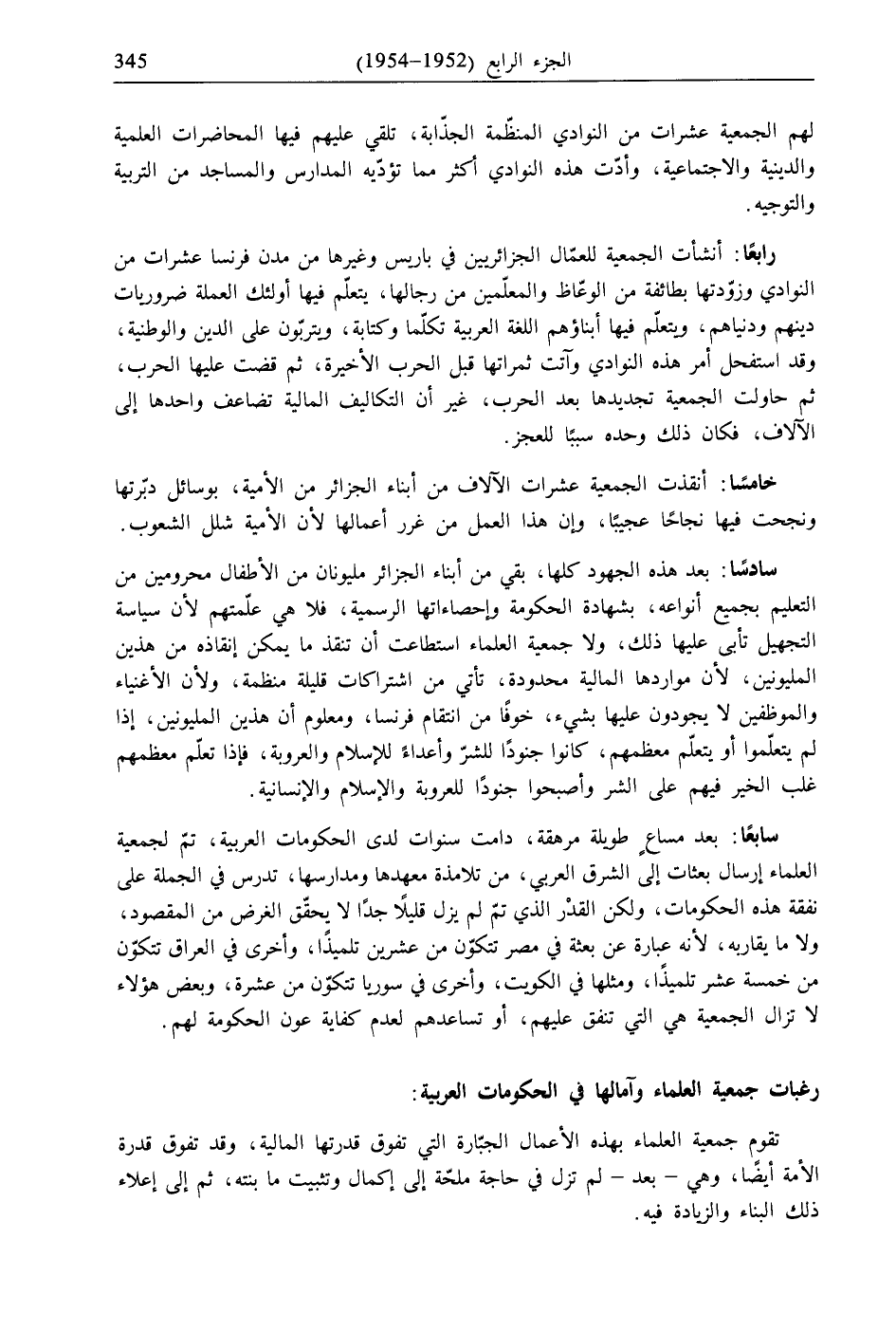 رابعًا: أنشأت الجمعية للعمّال الجزائريين في باريس وغيرها من مدن فرنسا عشرات من النوادي وزوّدتها بطائفة من الوعّاظ والمعلّمين من رجالها، يتعلّم فيها أولئك العملة ضروريات دينهم ودنياهم، ويتعلّم فيها أبناؤهم اللغة العربية تكلّما وكتابة، ويتربّون على الدين والوطنية، وقد استفحل أمر هذه النوادي وآتت ثمراتها قبل الحرب الأخيرة، ثم قضت عليها الحرب، ثم حاولت الجمعية تجديدها بعد الحرب، غير أن التكاليف المالية تضاعف واحدها إلى الآلاف، فكان ذلك وحده سببًا للعجز.