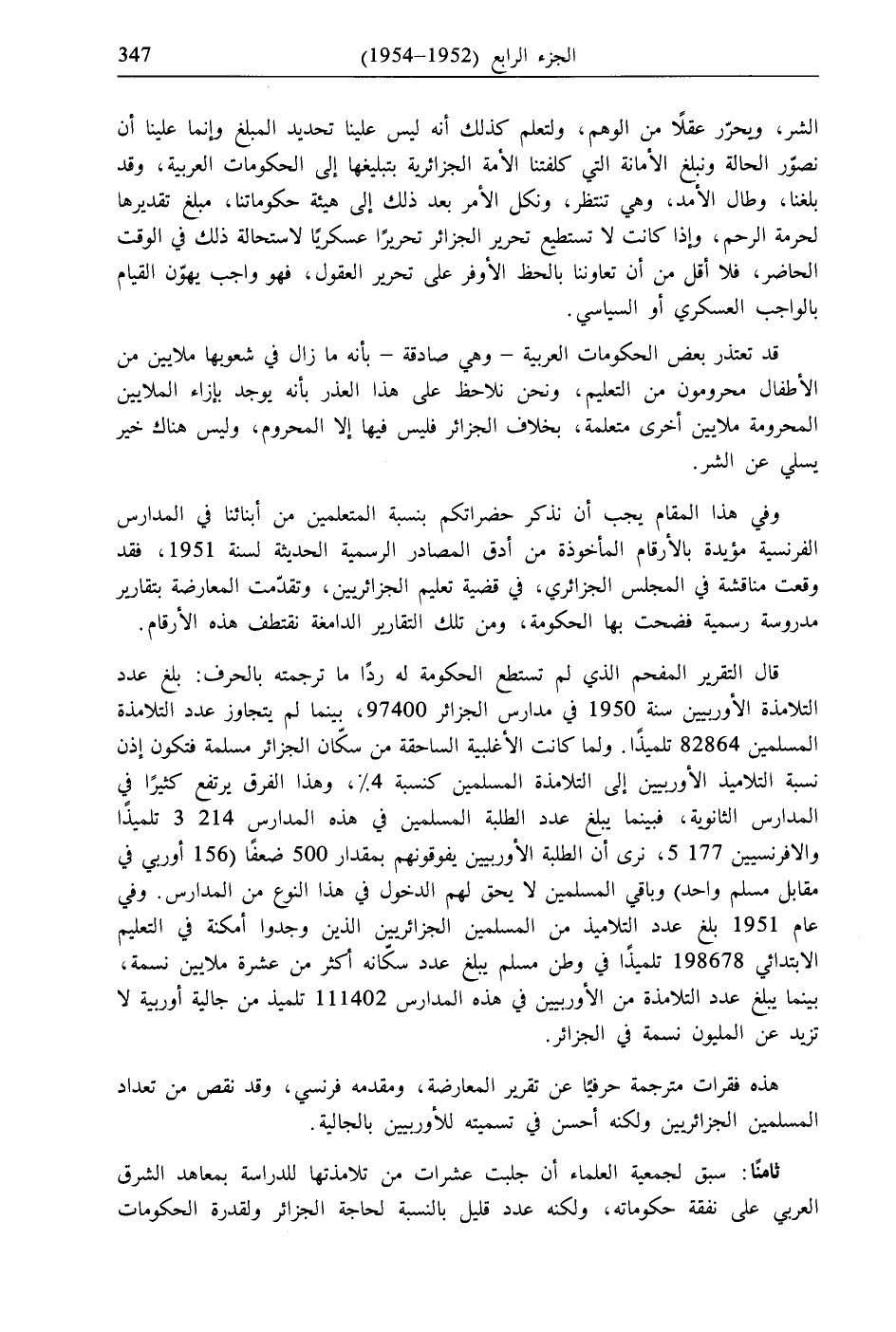 وفي هذا المقام يجب أن نذكر حضراتكم بنسبة المتعلمين من أبنائنا في المدارس الفرنسية مؤيدة بالأرقام المأخوذة من أدق المصادر الرسمية الحديثة لسنة 1951، فقد وقعت مناقشة في المجلس الجزائري، في قضية تعليم الجزائريين، وتقدّمت المعارضة بتقارير مدروسة رسمية فضحت بها الحكومة، ومن تلك التقارير الدامغة نقتطف هذه الأرقام.