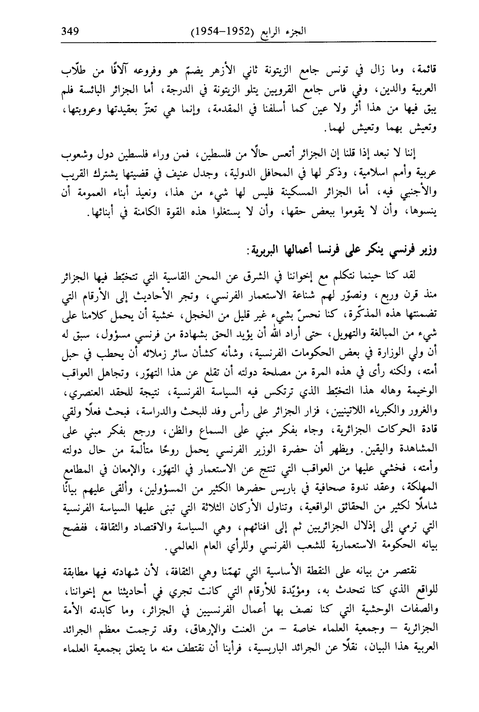 نقتصر من بيانه على النقطة الأساسية التي تهمّنا وهي الثقافة، لأن شهادته فيها مطابقة للواقع الذي كنا نتحدث به، ومؤيّدة للأرقام التي كانت تجري في أحاديثنا مع إخواننا، والصفات الوحشية التي كنا نصف بها أعمال الفرنسيين في الجزائر، وما كابدته الأمة الجزائرية- وجمعية العلماء خاصة- من العنت والإرهاق، وقد ترجمت معظم الجرائد العربية هذا البيان، نقلًا عن الجرائد الباريسية، فرأينا أن نقتطف منه ما يتعلق بجمعية العلماء