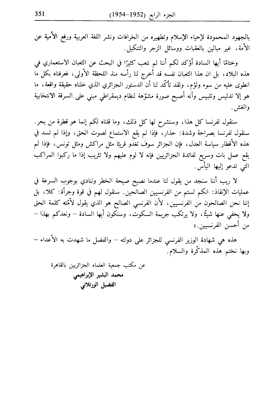وختامًا أيها السادة أؤكد لكم أننا لم نتعب كثيرًا في البحث عن الثعبان الاستعماري في هذه البلاد، بل ان هذا الثعبان نفسه قد أخرج لنا رأسه منذ اللحظة الأولى، فعرفناه بكل ما انطوى عليه من سوء ولؤم، ولقد تأكّد لنا أن الدستور الجزائري الذي خلناه حقيقة واقعة، ما هو إلا تدليس وتلبيس وأنه أصبح صورة مشوّهة لنظام ديمقراطي مبني على السرقة الانتخابية والغش.