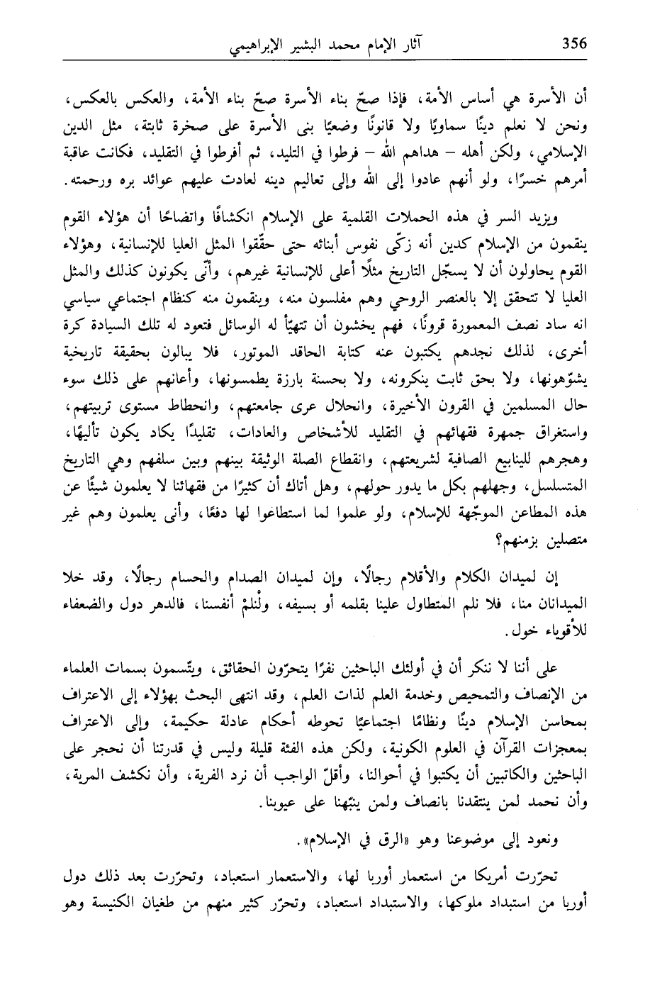 أن الأسرة هي أساس الأمة، فإذا صحّ بناء الأسرة صحّ بناء الأمة، والعكس بالعكس، ونحن لا نعلم دينًا سماويًا ولا قانونًا وضعيًا بنى الأسرة على صخرة ثابتة، مثل الدين الإسلامي، ولكن أهله- هداهم الله- فرطوا في التليد، ثم أفرطوا في التقليد، فكانت عاقبة أمرهم خسرًا، ولو أنهم عادوا إلى الله وإلى تعاليم دينه لعادت عليهم عوائد بره ورحمته.