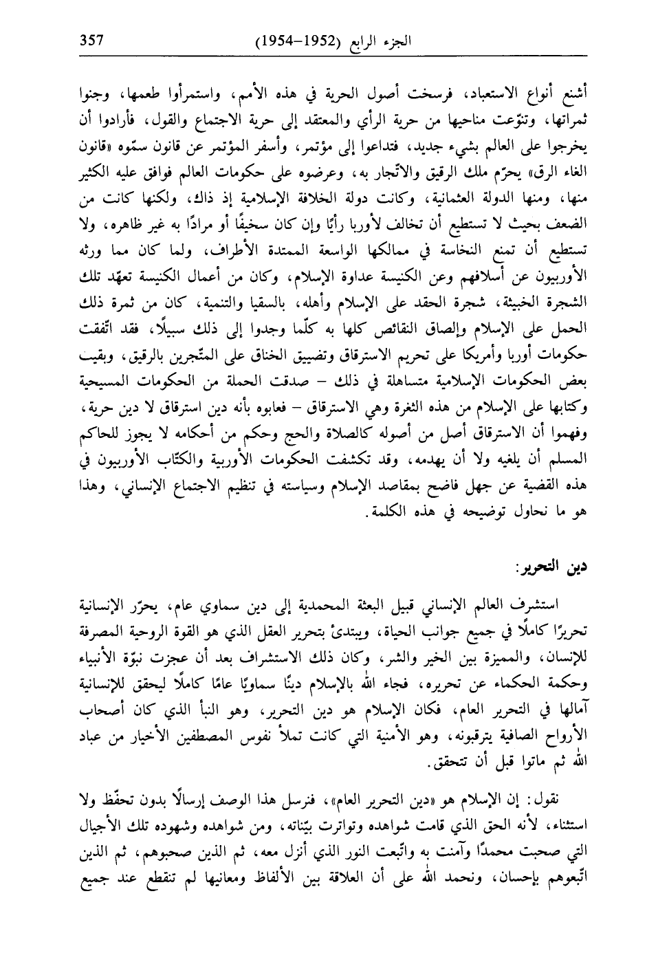 نقول: إن الإسلام هو "دين التحرير العام"، فنرسل هذا الوصف إرسالًا بدون تحفّظ ولا استثناء، لأنه الحق الذي قامت شواهده وتواترت بيّناته، ومن شواهده وشهوده تلك الأجيال التي صحبت محمدًا وآمنت به واتّبعت النور الذي أنزل معه، ثم الذين صحبوهم، ثم الذين اتّبعوهم بإحسان، ونحمد الله على أن العلاقة بين الألفاظ ومعانيها لم تنقطع عند جميع