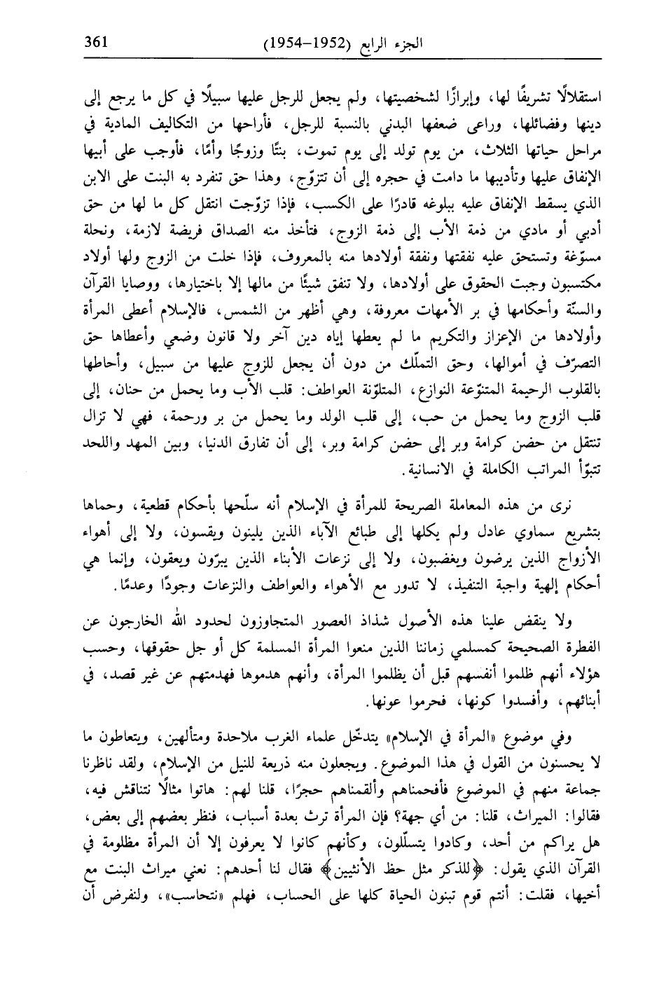استقلالًا تشريفًا لها، وإبرازًا لشخصيتها، ولم يجعل للرجل عليها سبيلًا في كل ما يرجع إلى دينها وفضائلها، وراعى ضعفها البدني بالنسبة للرجل، فأراحها من التكاليف المادية في مراحل حياتها الثلاث، من يوم تولد إلى يوم تموت، بنتًا وزوجًا وأمًا، فأوجب على أبيها الإنفاق عليها وتأديبها ما دامت في حجره إلى أن تتزوّج، وهذا حق تنفرد به البنت على الابن الذي يسقط الإنفاق عليه ببلوغه قادرًا على الكسب، فإذا تزوّجت انتقل كل ما لها من حق أدبي أو مادي من ذمة الأب إلى ذمة الزوج، فتأخذ منه الصداق فريضة لازمة، ونحلة مسوّغة وتستحق عليه نفقتها ونفقة أولادها منه بالمعروف، فإذا خلت من الزوج ولها أولاد مكتسبون وجبت الحقوق على أولادها، ولا تنفق شيئًا من مالها إلا باختيارها، ووصايا القرآن والسنّة وأحكامها في بر الأمهات معروفة، وهي أظهر من الشمس، فالإسلام أعطى المرأة وأولادها من الإعزاز والتكريم ما لم يعطها إياه دين آخر ولا قانون وضعي وأعطاها حق التصرّف في أموالها، وحق التملّك من دون أن يجعل للزوج عليها من سبيل، وأحاطها بالقلوب الرحيمة المتنوّعة النوازع، المتلوّنة العواطف: قلب الأب وما يحمل من حنان، إلى قلب الزوج وما يحمل من حب، إلى قلب الولد وما يحمل من بر ورحمة، فهي لا تزال تنتقل من حضن كرامة وبر إلى حضن كرامة وبر، إلى أن تفارق الدنيا، وبين المهد واللحد تتبوّأ المراتب الكاملة في الانسانية.