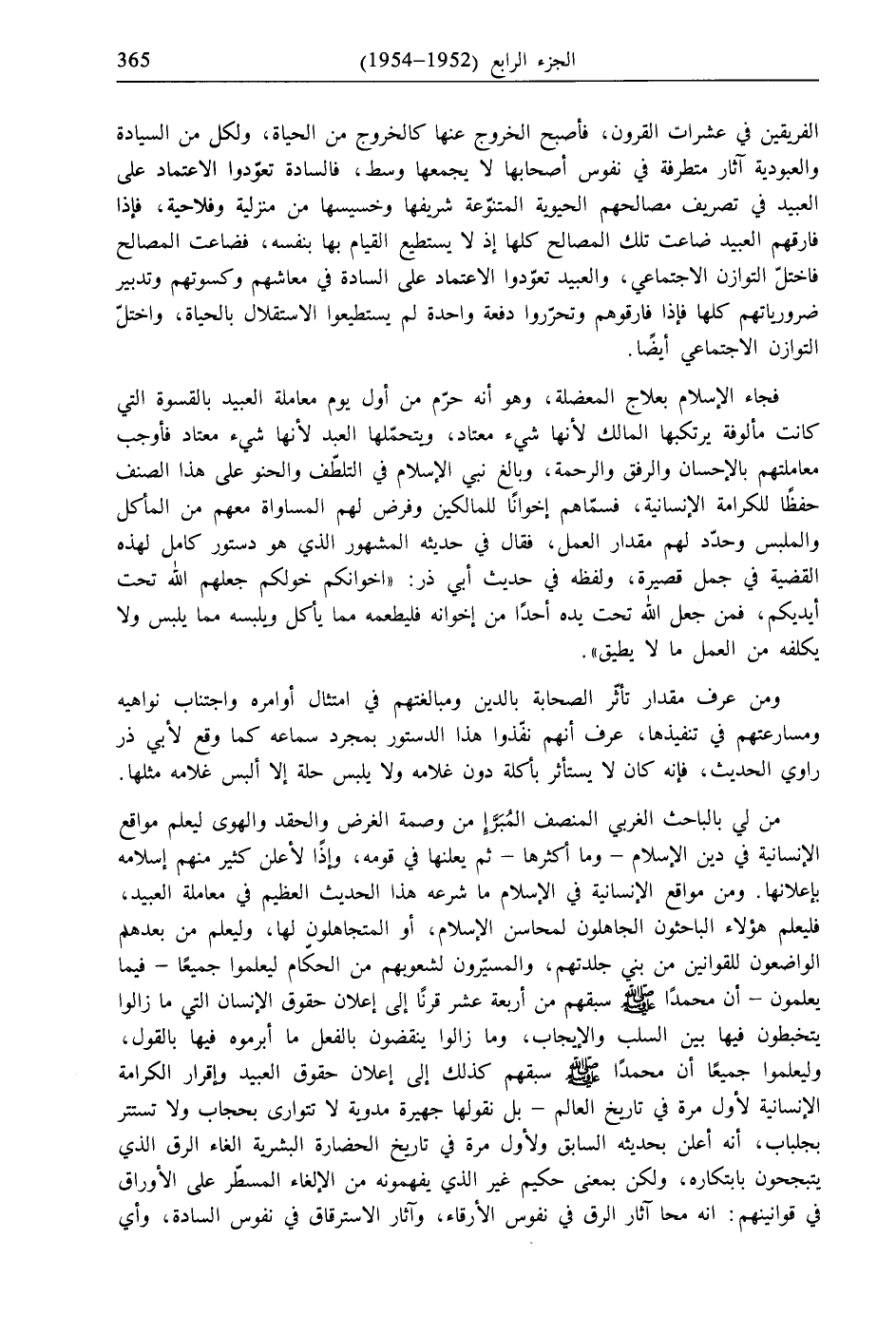 فجاء الإسلام بعلاج المعضلة، وهو أنه حرّم من أول يوم معاملة العبيد بالقسوة التي كانت مألوفة يرتكبها المالك لأنها شيء معتاد، ويتحمّلها العبد لأنها شيء معتاد فأوجب معاملتهم بالإحسان والرفق والرحمة، وبالغ نبي الإسلام في التلطّف والحنو على هذا الصنف حفظًا للكرامة الإنسانية، فسمّاهم إخوانًا للمالكين وفرض لهم المساواة معهم من المأكل والملبس وحدّد لهم مقدار العمل، فقال في حديثه المشهور الذي هو دستور كامل لهذه القضية في جمل قصيرة، ولفظه في حديث أبي ذر: «إِخْوَانُكُمْ خَوَلُكُمْ جَعَلَهُمُ اللَّهُ تَحْتَ أَيْدِيكُمْ، فَمَنْ جَعَلَ اللهُ تَحْتَ يَدِهِ أَحَدًا مِنْ إِخْوَانِهِ فَلْيُطْعِمْهُ مِمَّا يَأْكُلُ وَيُلْبِسْهُ مِمَّا يَلْبَسُ وَلَا يُكَلِّفْهُ مِنَ الْعَمَلِ مَا لَا يُطِيقُ».